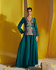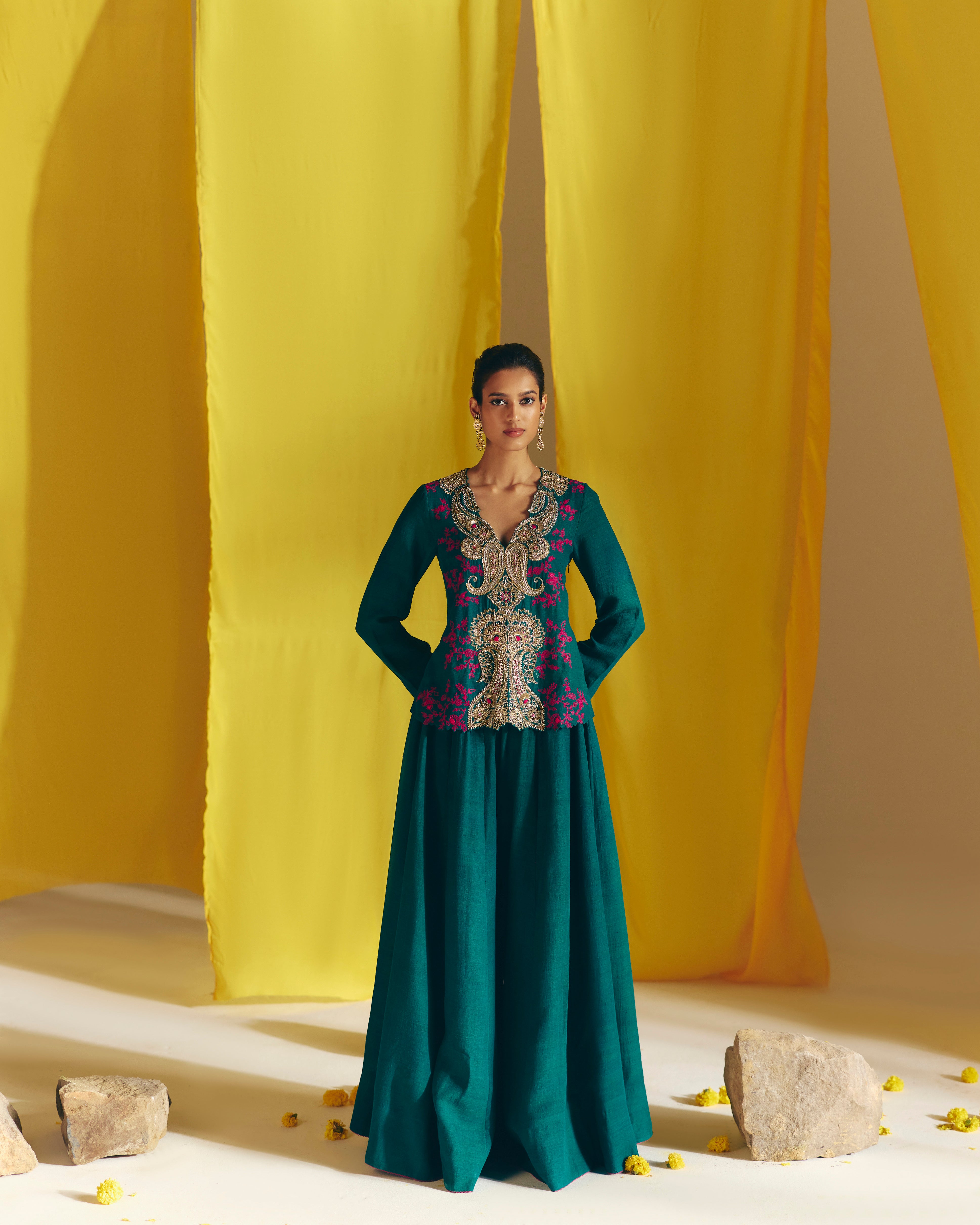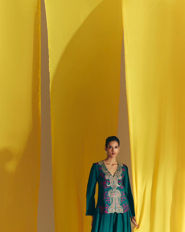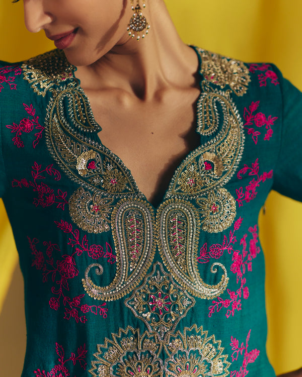 A deep green matka silk short kurta adorned with paisleys and ornate flowers in zardozi embroidery at the front and intricate floral jaal with resham delicately placed along the sides. Paired with matka silk gathered drawstring pants.