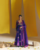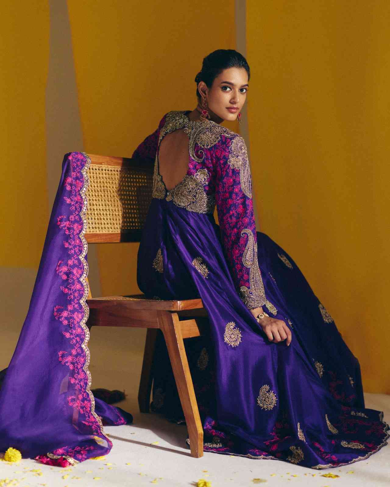 Pure silk Anarkali with pearl and zardozi hand embroidered paisleys, florals and geometric motifs with intricate floral Jaal in contrast hot pink Resham on the yoke and panelled sleeves. Paired with a purple organza dupatta with scalloped border in zardozi and intricate floral Jaal in hot pink Resham with hot pink handmade tassels.