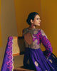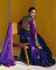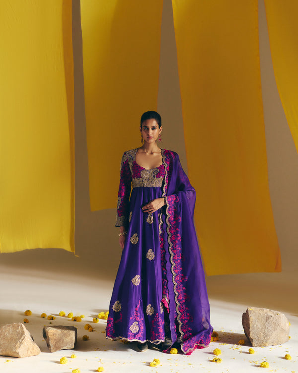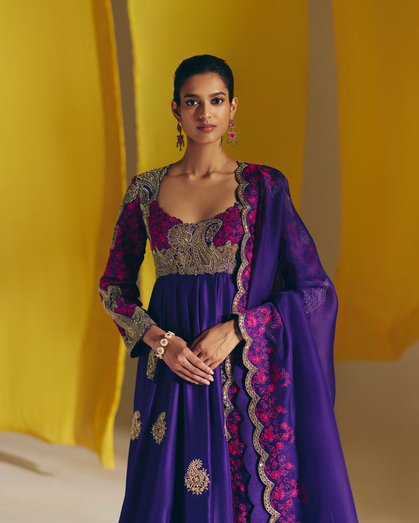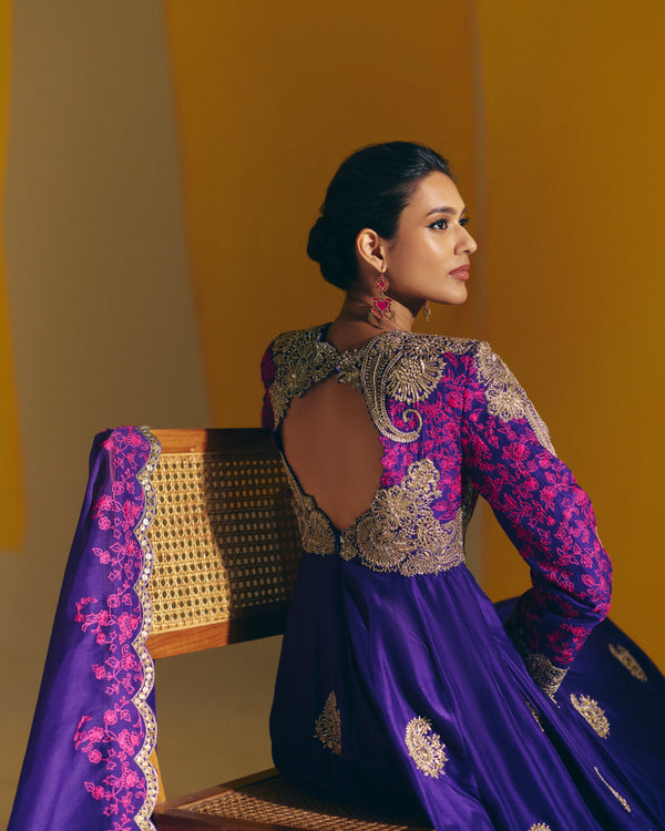 A purple silk anarkali adorned with hand-embroidered zardozi paisleys and floral motifs, highlighted with intricate floral detailing in hot-pink resham on the yoke and panelled sleeves. Paired with an organza dupatta featuring a scalloped zardozi border, delicate hot-pink resham embroidery, and handmade tassels.