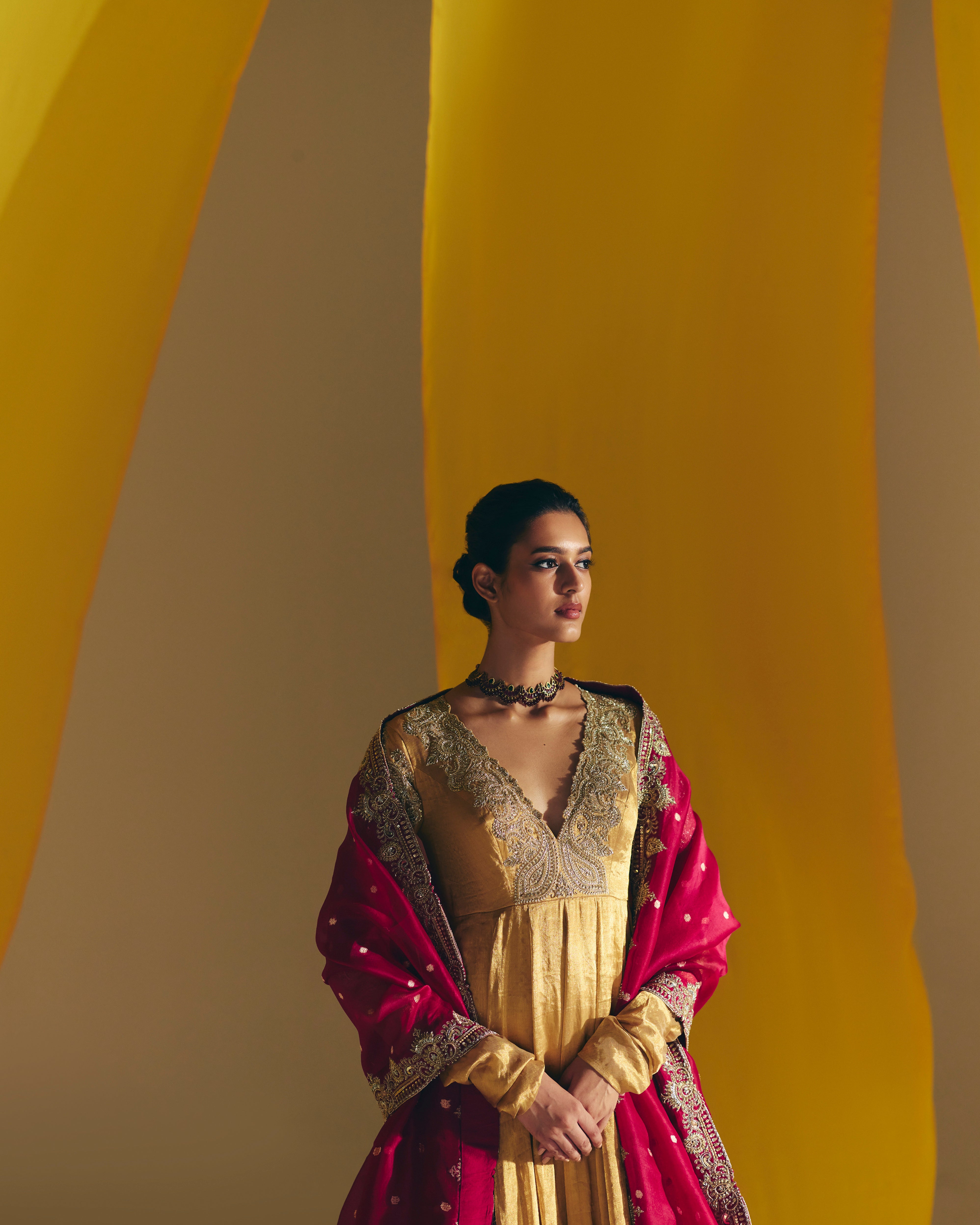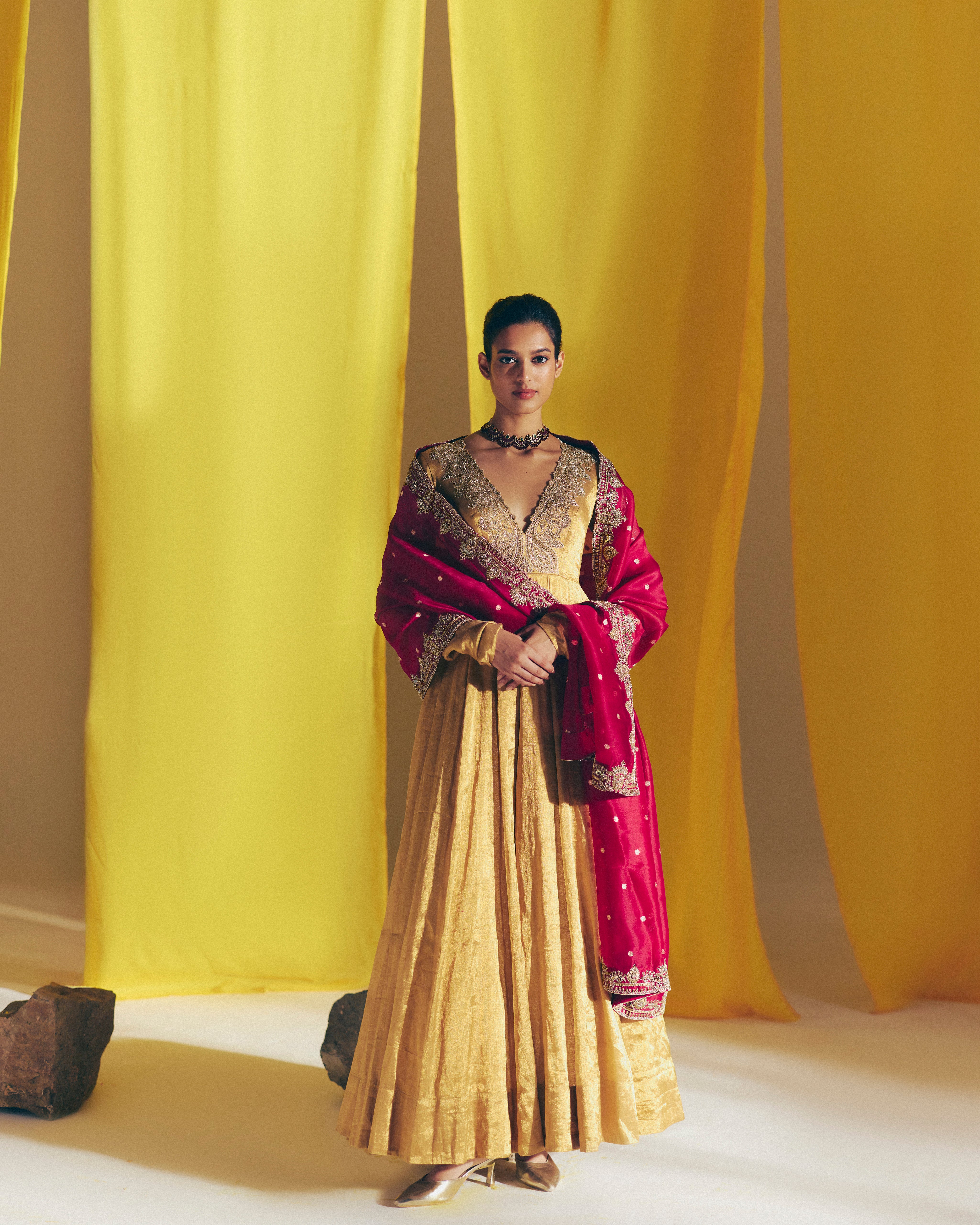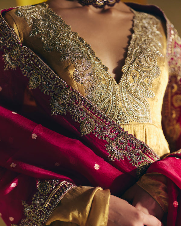 A gold tissue anarkali with zardozi hand-embroidered intricate border and structured paisleys along the neckline, adorned with beautifully crafted peacocks and lotus on the chudi sleeves. Paired with a maroon organza dupatta with butis and zardozi.