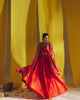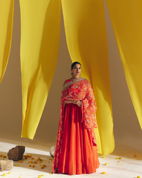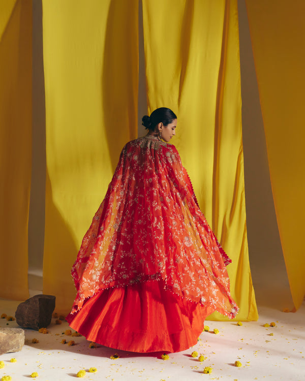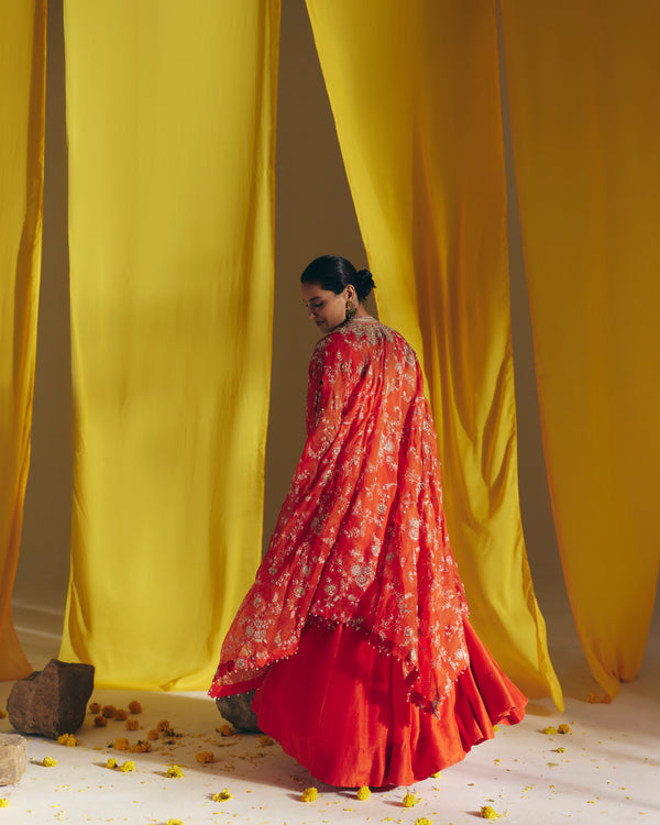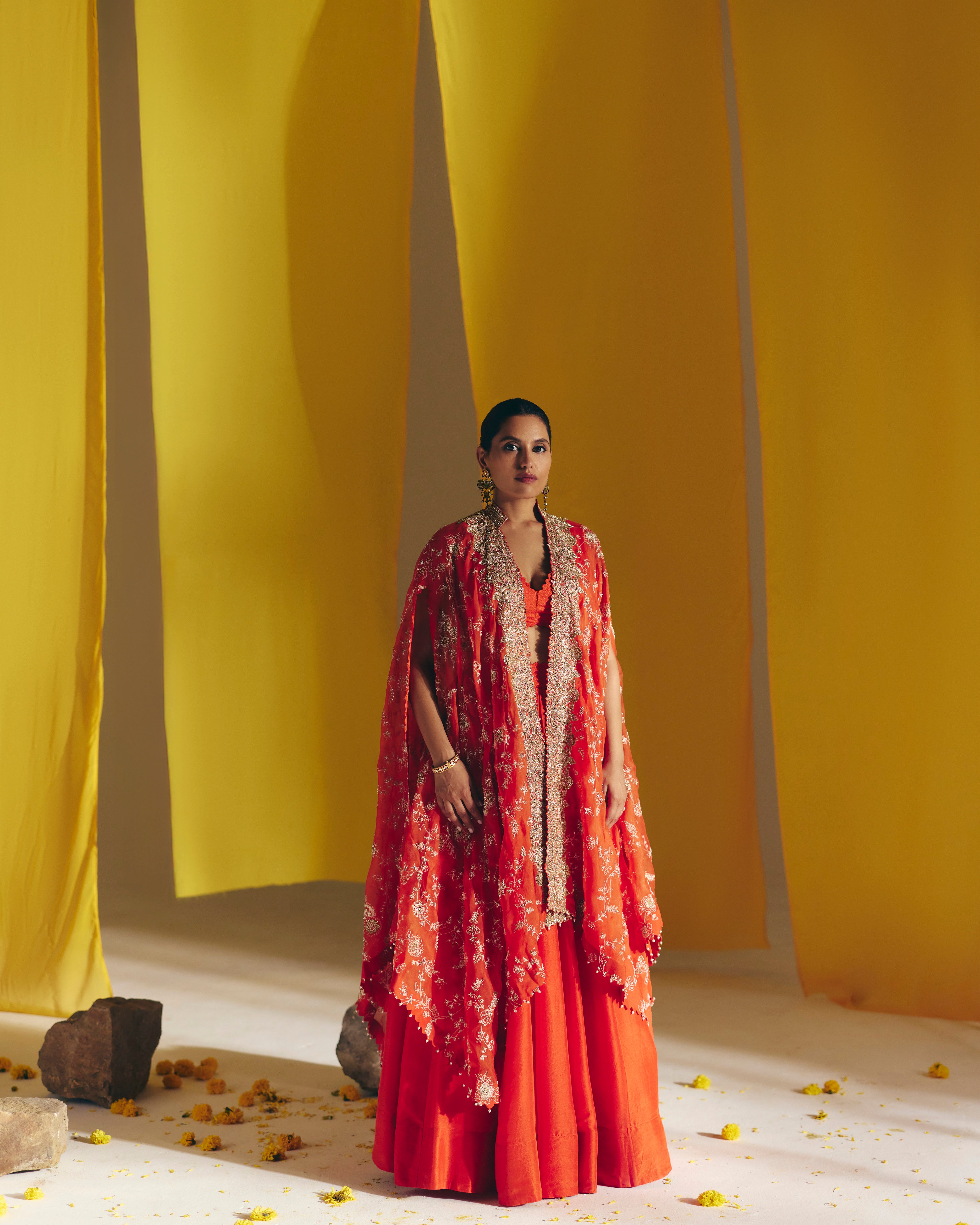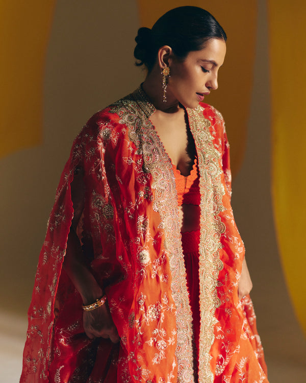 An orange silk organza cape crafted with intricate jaal artwork highlighted with zardozi and pearls, edged with pearls at the hem. Paired with a short blouse and a gathered lehenga, adorned with cross lines textured embroidery on the blouse and the lehenga waist belt.