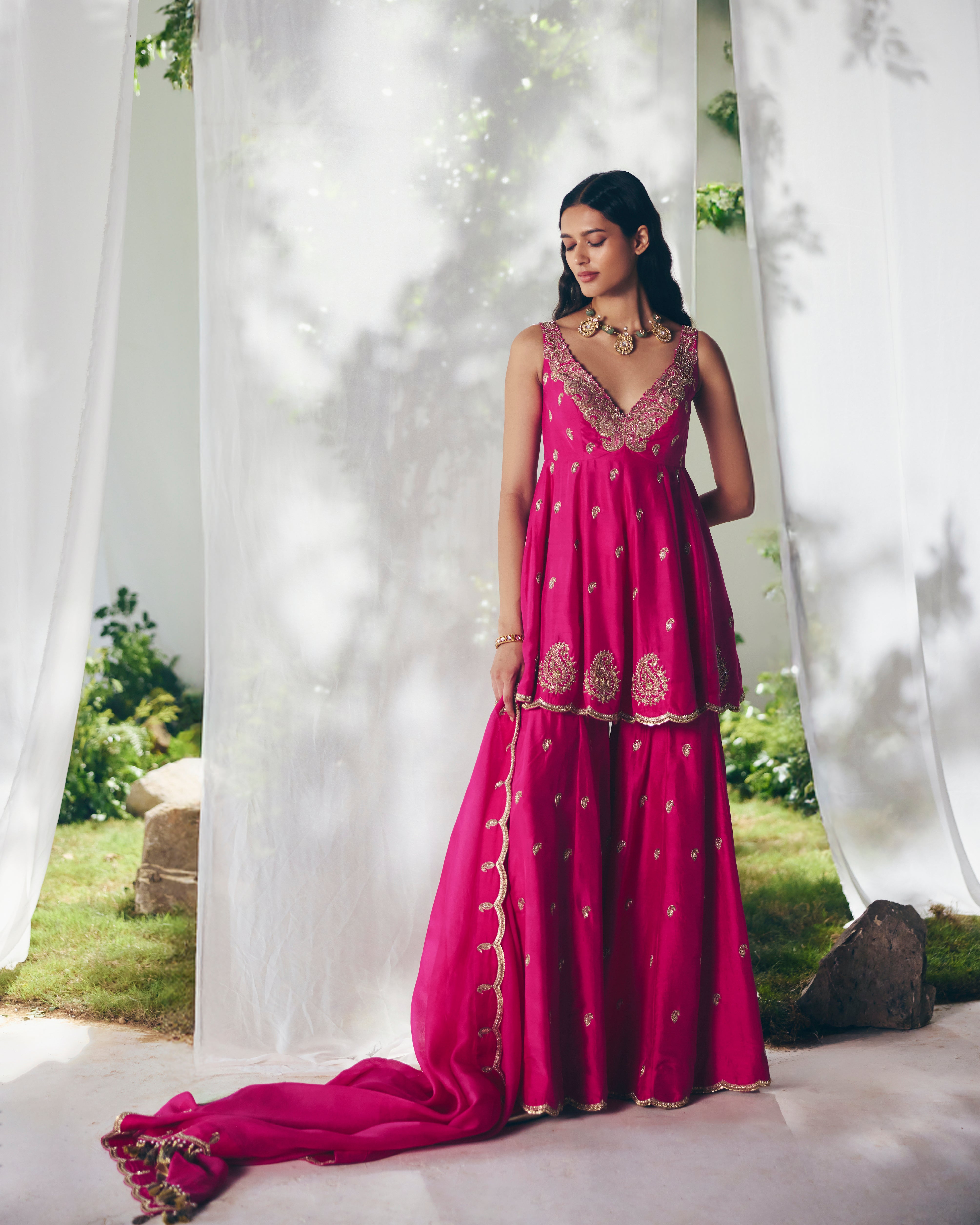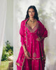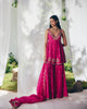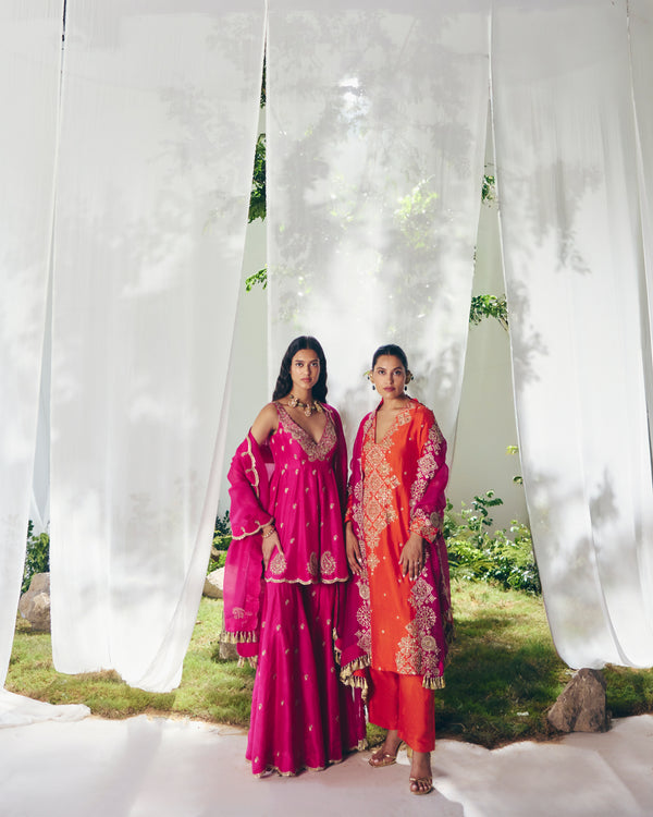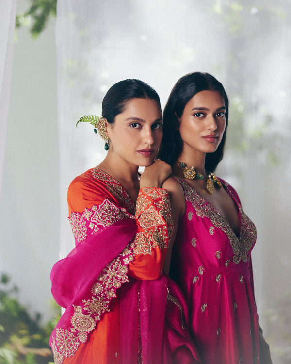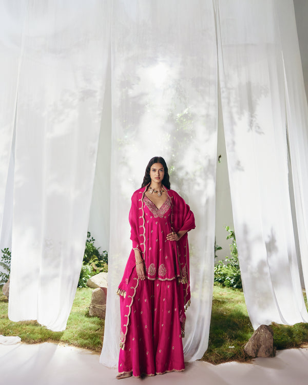 A silk pink short Anarkali adorned with an intricate zardozi border along the neckline, tiny paisley Butta scattered across and intricate paisley motifs along the hemline. Paired with sharara-style pants and an organza dupatta finished with an embroidered zardozi scalloped border, lined with tiny paisleys.
