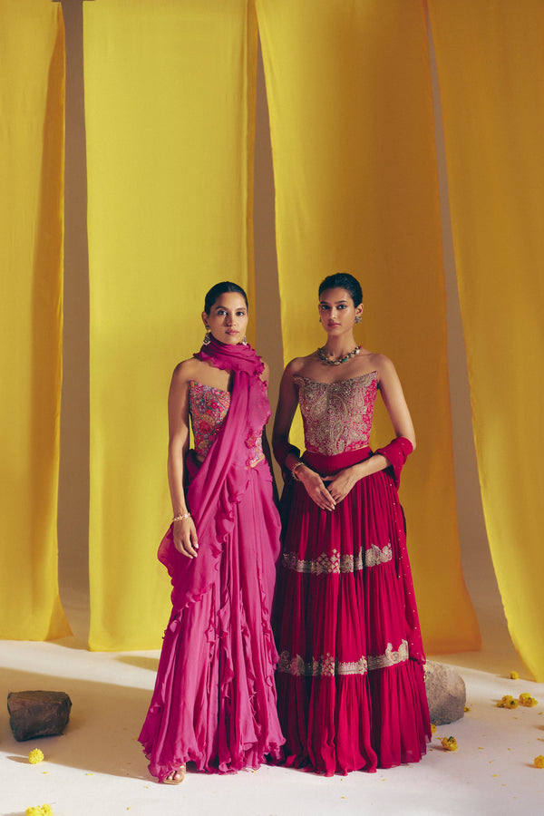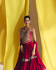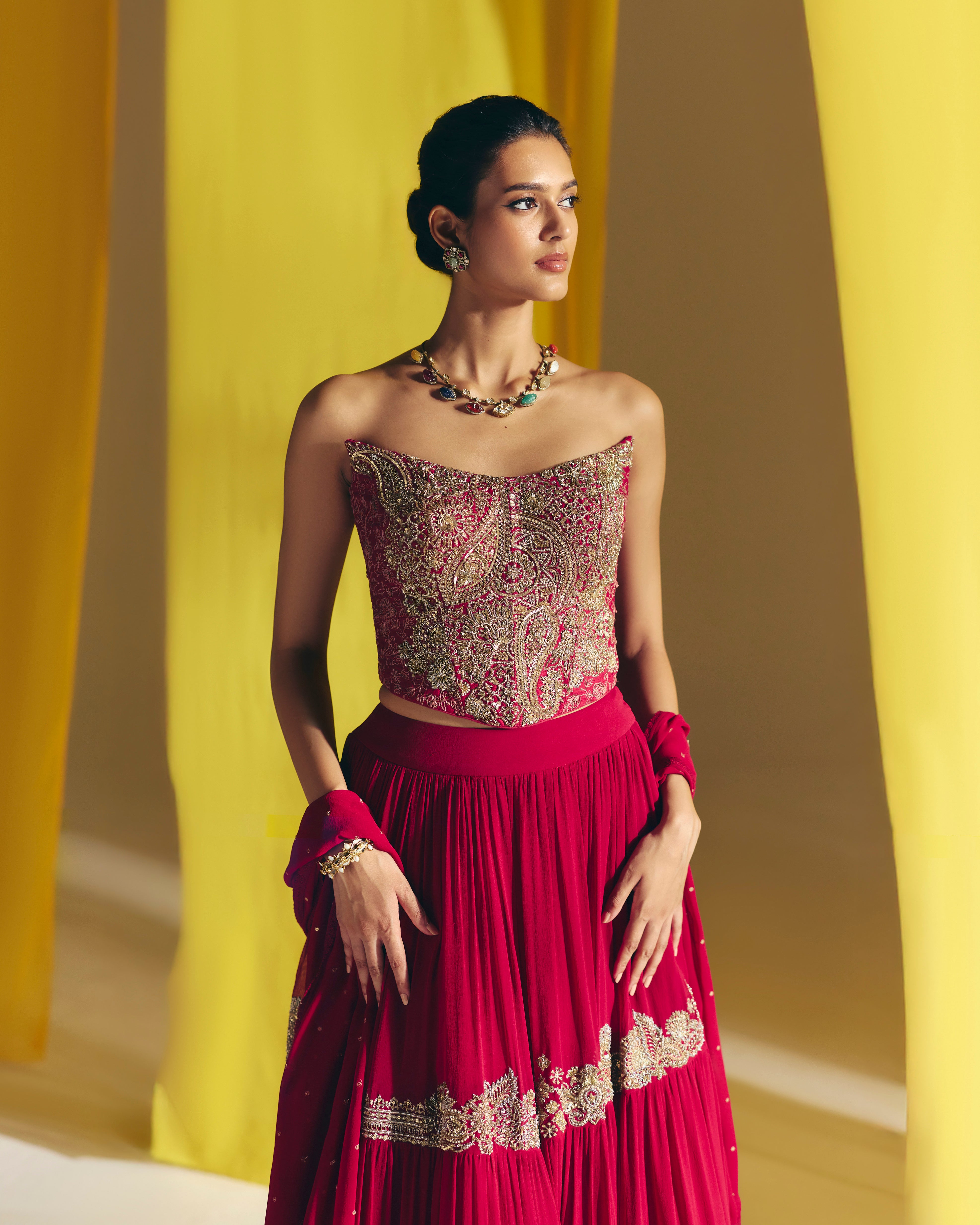 A maroon raw-silk corset with a combination of paisleys, ornate flowers, and geomtric motifs artistically placed along the centre, crafted with zardosi and intricate floral jaal delicately placed throughout the corset with resham. Paired with a 3-tiered pure georgette skirt, adorned with an intricate zardosi embroidered border running along the tiers. A pure georgette dupatta with a delicate lace border and sequin-resham bandhani scattered all over.
