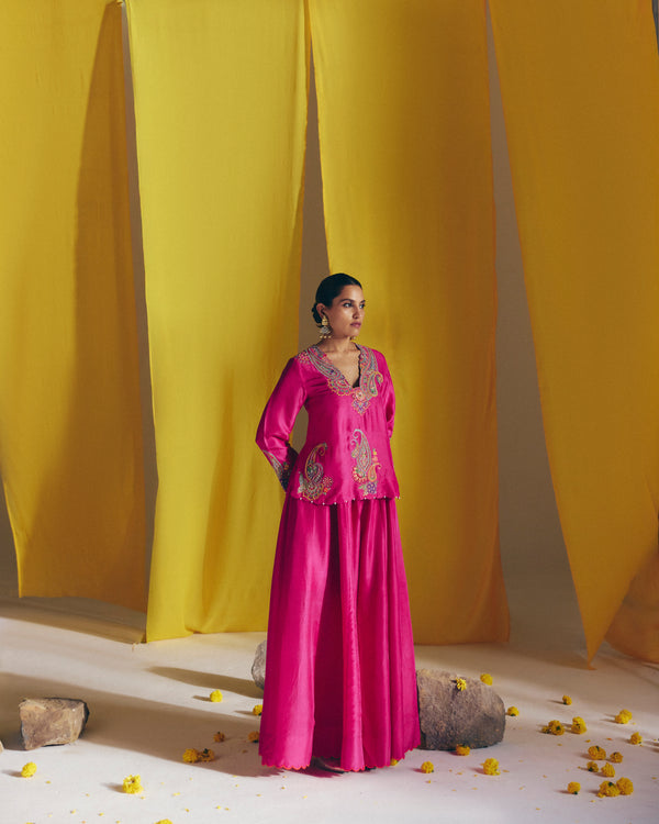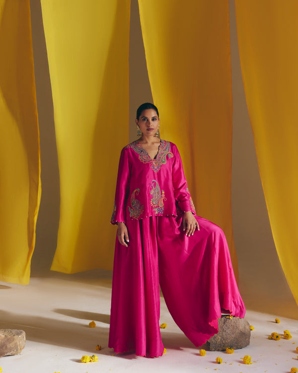 A short kurta adorned with a combination of paisleys, geometric motifs, ornate and contemporary flowers placed in artistically crafted bunches. Hand-embroidered with multi-color resham and zardozi. Paired with pure silk gathered drawstring pants.