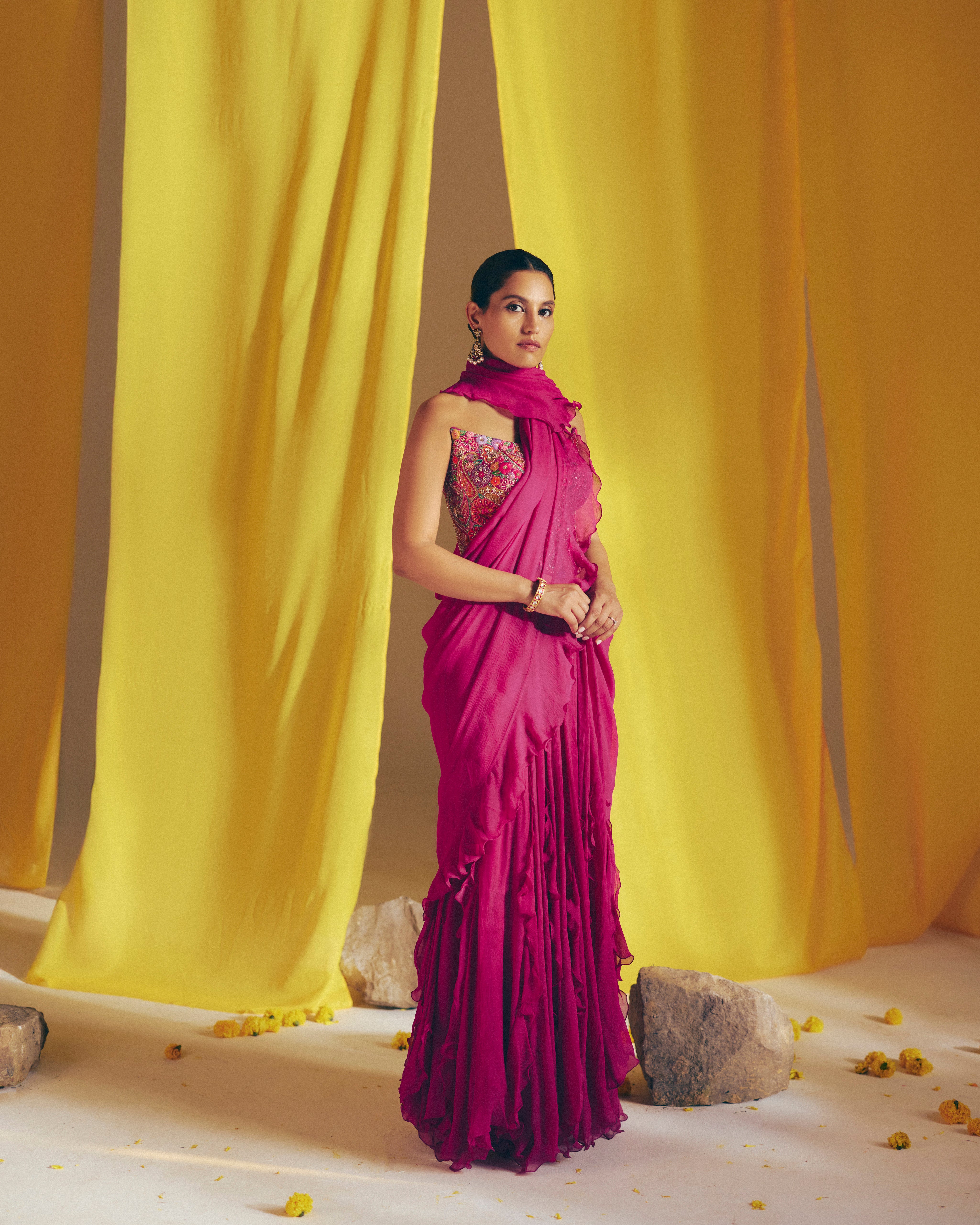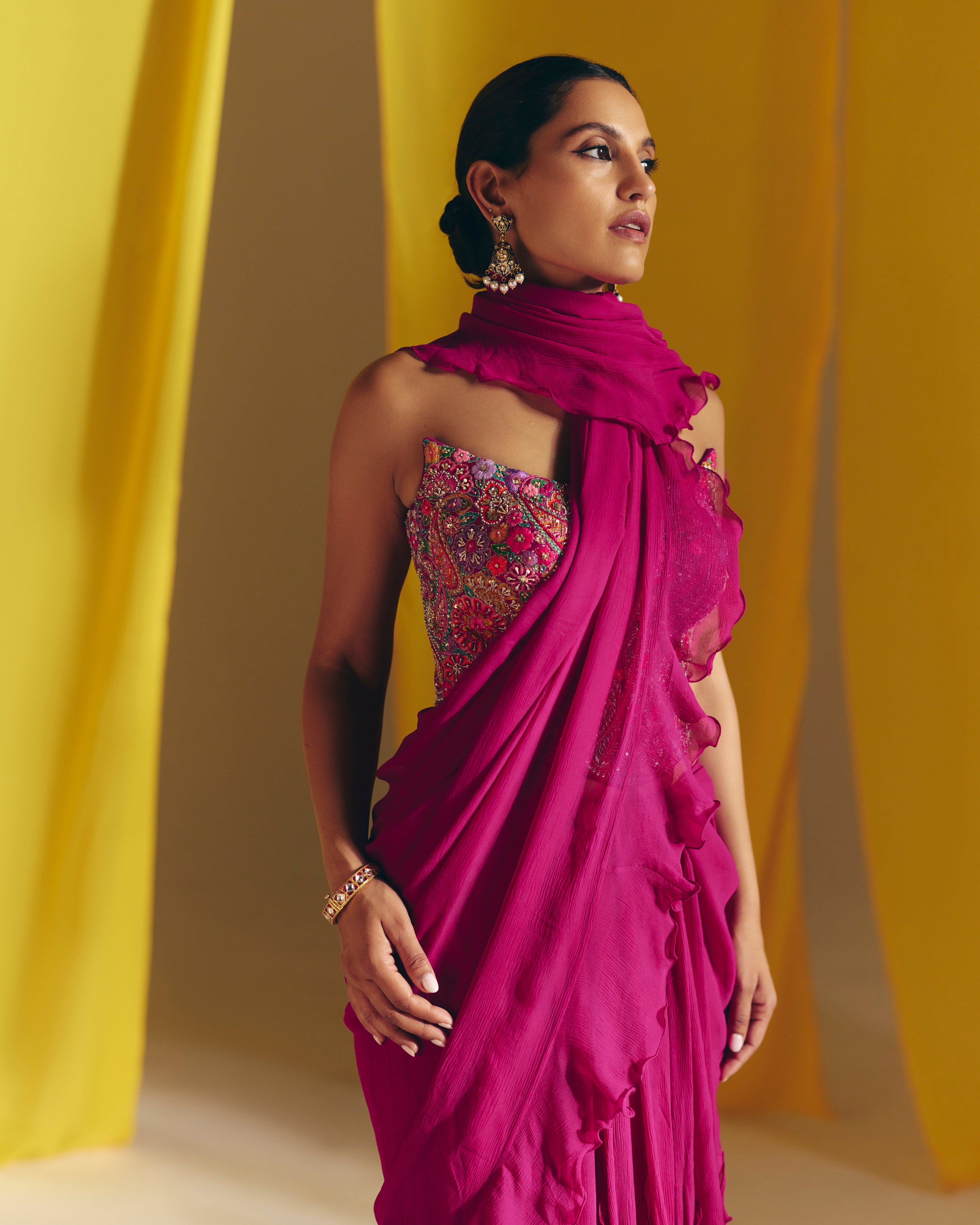 A delicate chiffon ruffle saree paired with a raw silk corset hand embroidered with floral artwork using multicolored resham and zardozi. This set comes with an in-skirt.