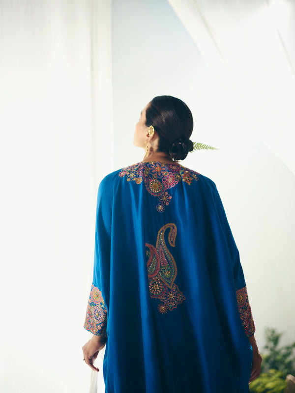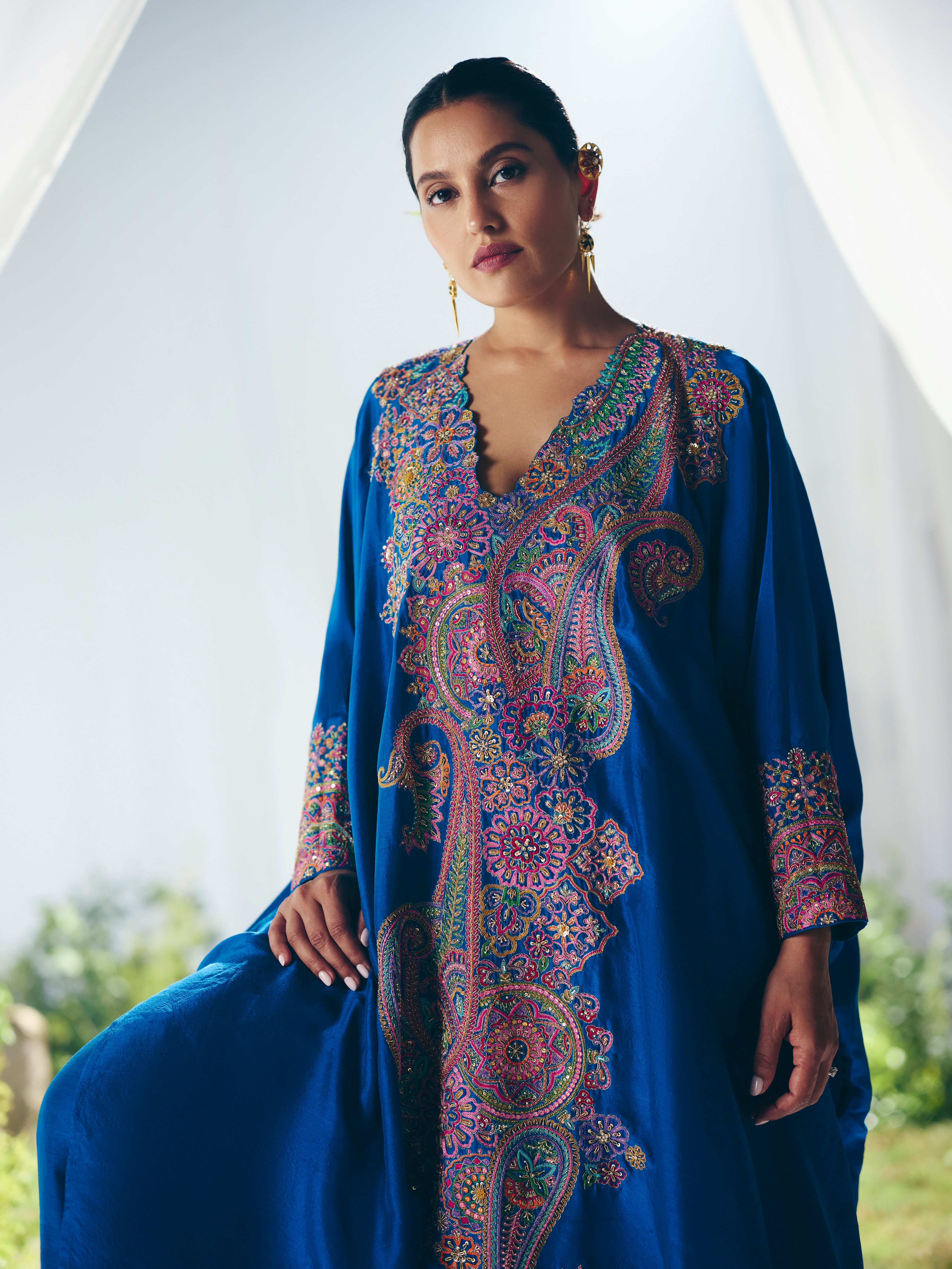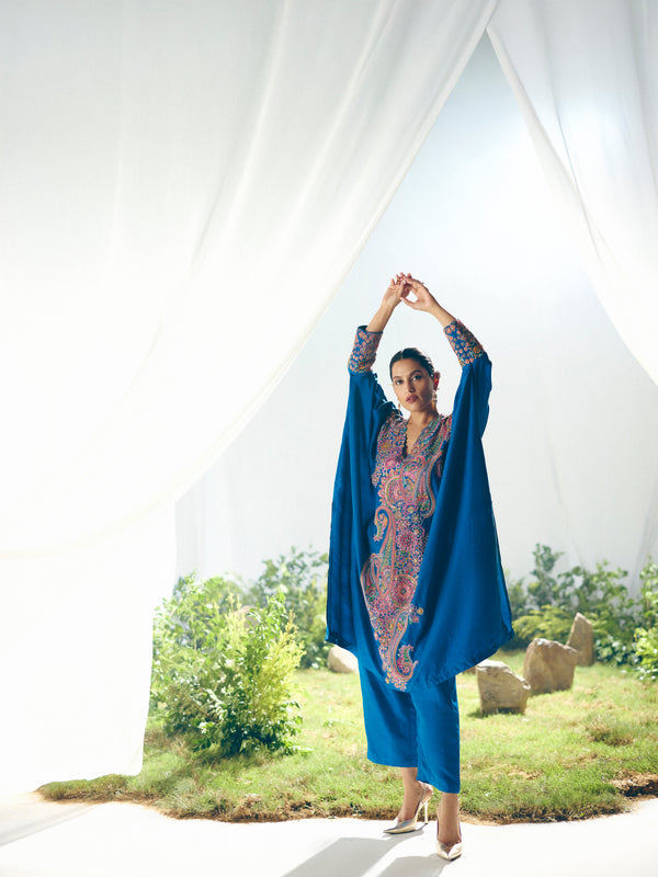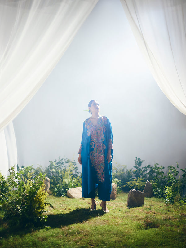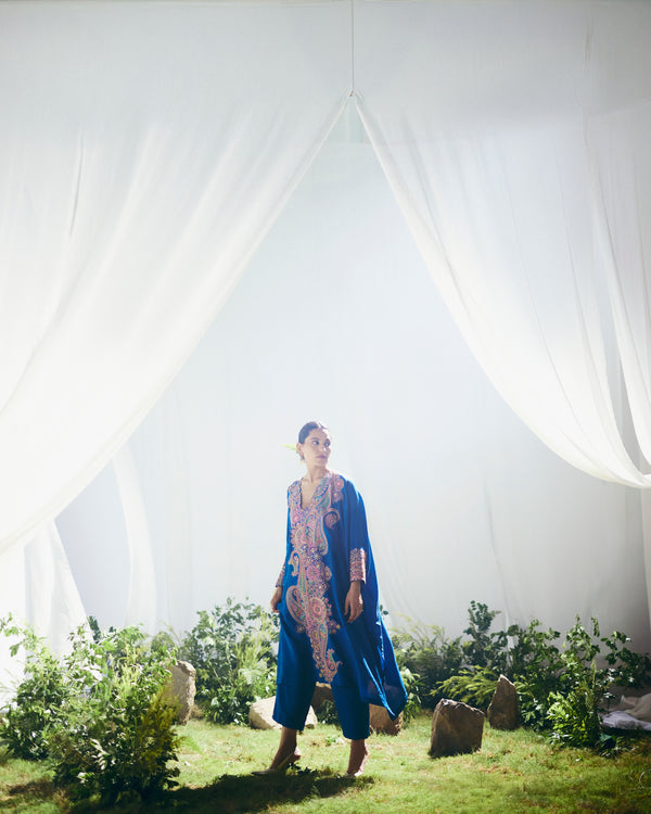 A vivid blue silk long cuff kurta adorned with a combination of signature long paisleys, mandala, geometric motifs, and contemporary flowers placed along the front and cuffs embroidered with multi-colored resham and zardozi work. Paired with a silk straight pants.