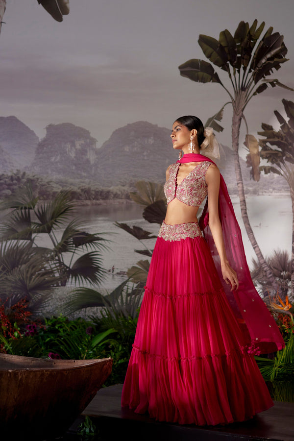 Intricately hand embroidered blouse paired with chiffon tiered skirt and dupatta.