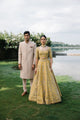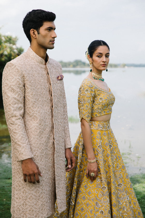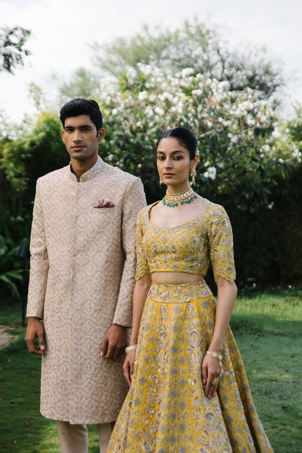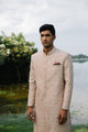Beige sherwani with fine zardozi hand-embroidery. Paired with silk straight pants. Usually comes with a plain beige silk inner kurta.