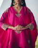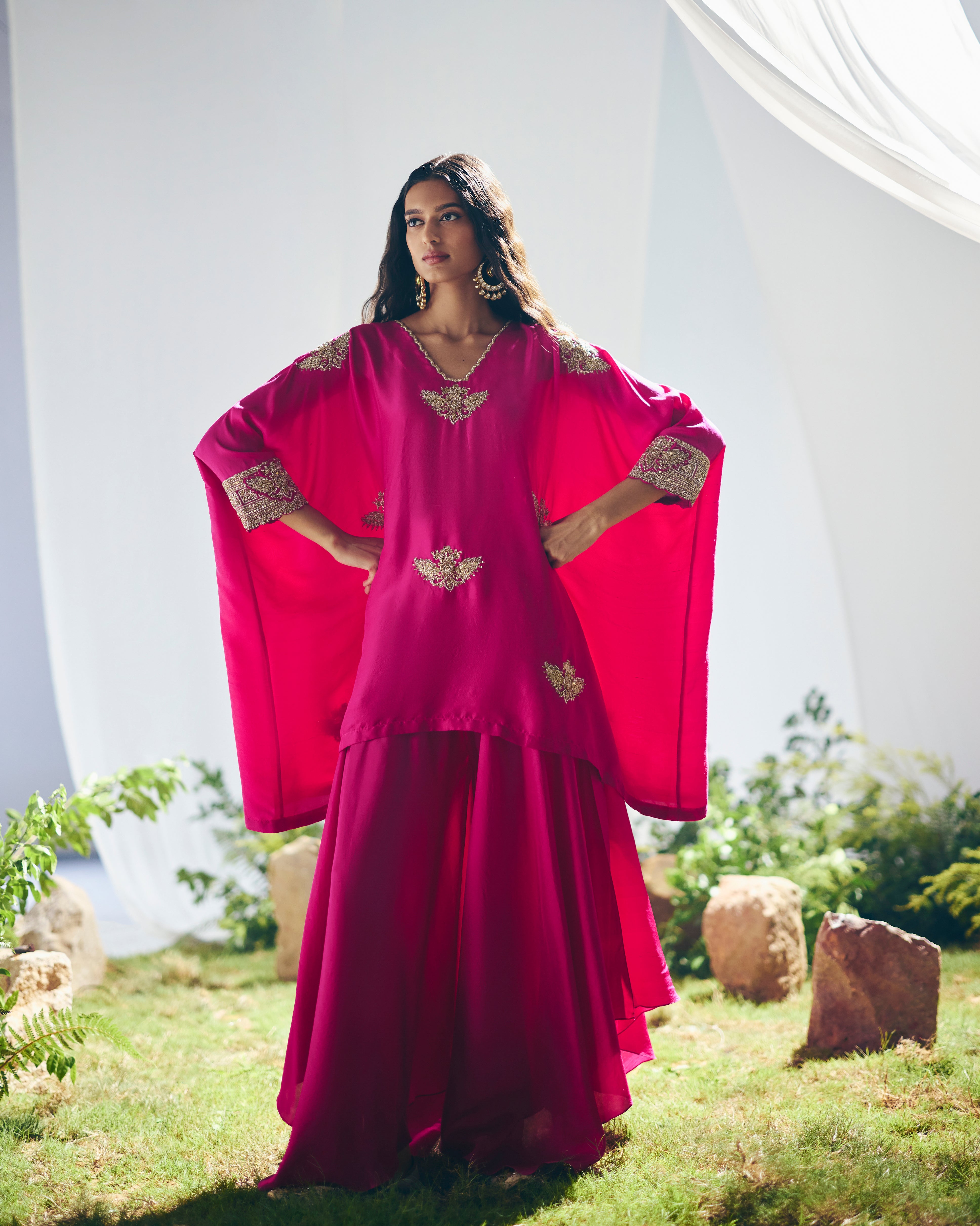 A silk short-cuff kaftan with our signature Garuda motif placed all over. Cuffs are adorned with intricate zardozi and pearl hand embroidery. Paired with silk high-low kaftan pants.