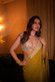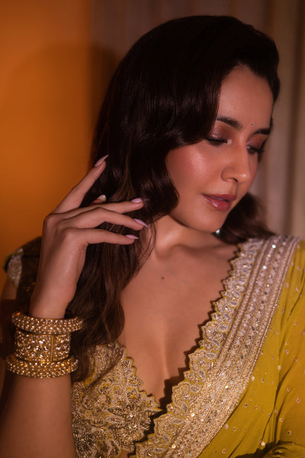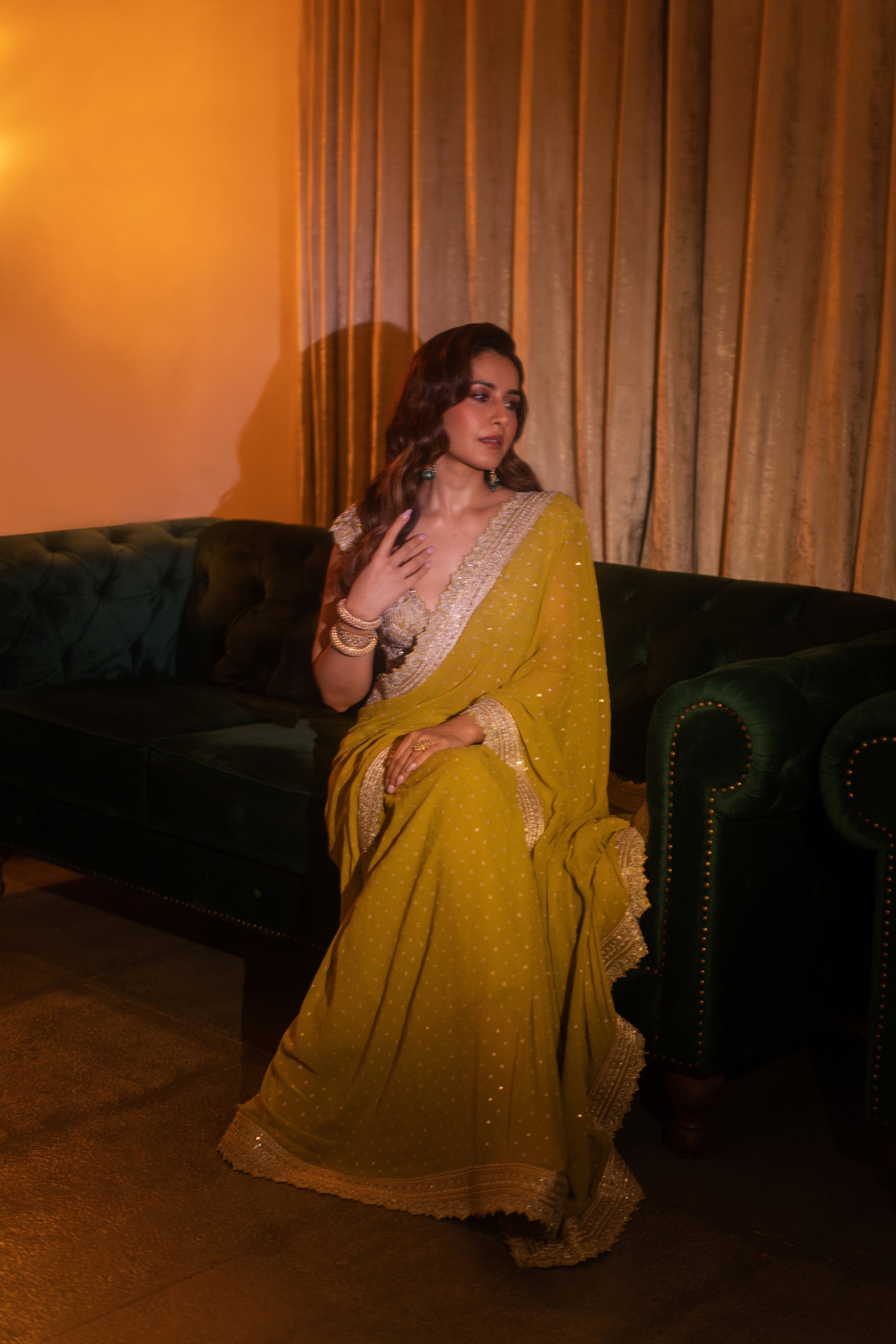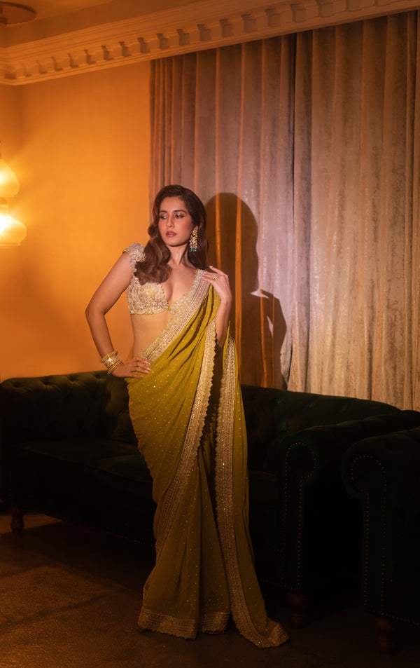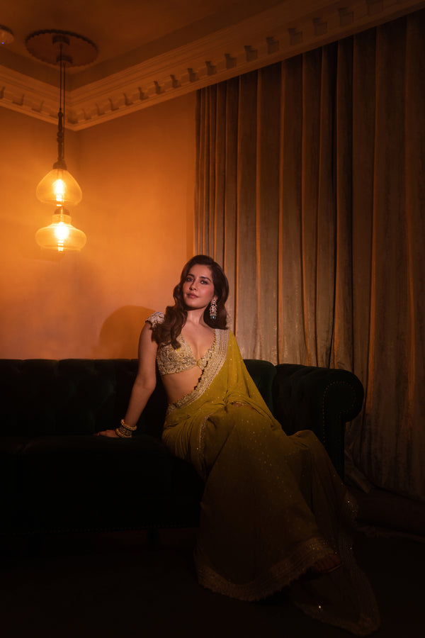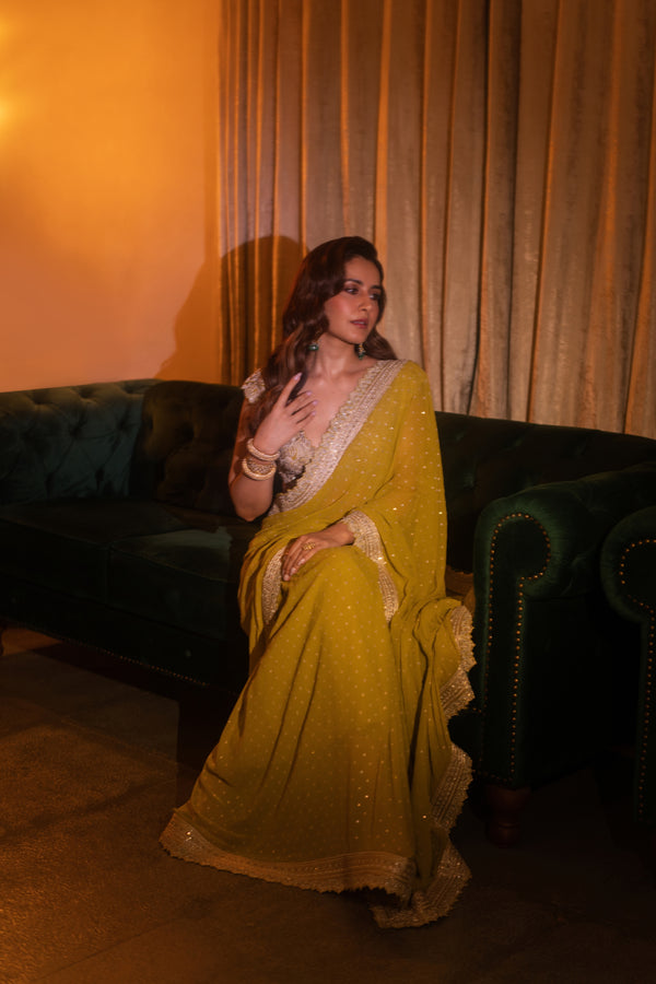 A georgette lime green saree with a raw silk zardozi, pearls, and ivory resham embroidered border. Sequin and resham bandhani spread all over the saree.