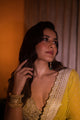 Paired with a raw silk blouse with petal sleeves and a deep V-neckline at the front and back. Floral and paisley artwork embroidered in ivory resham, zardozi, and pearls all over the blouse.