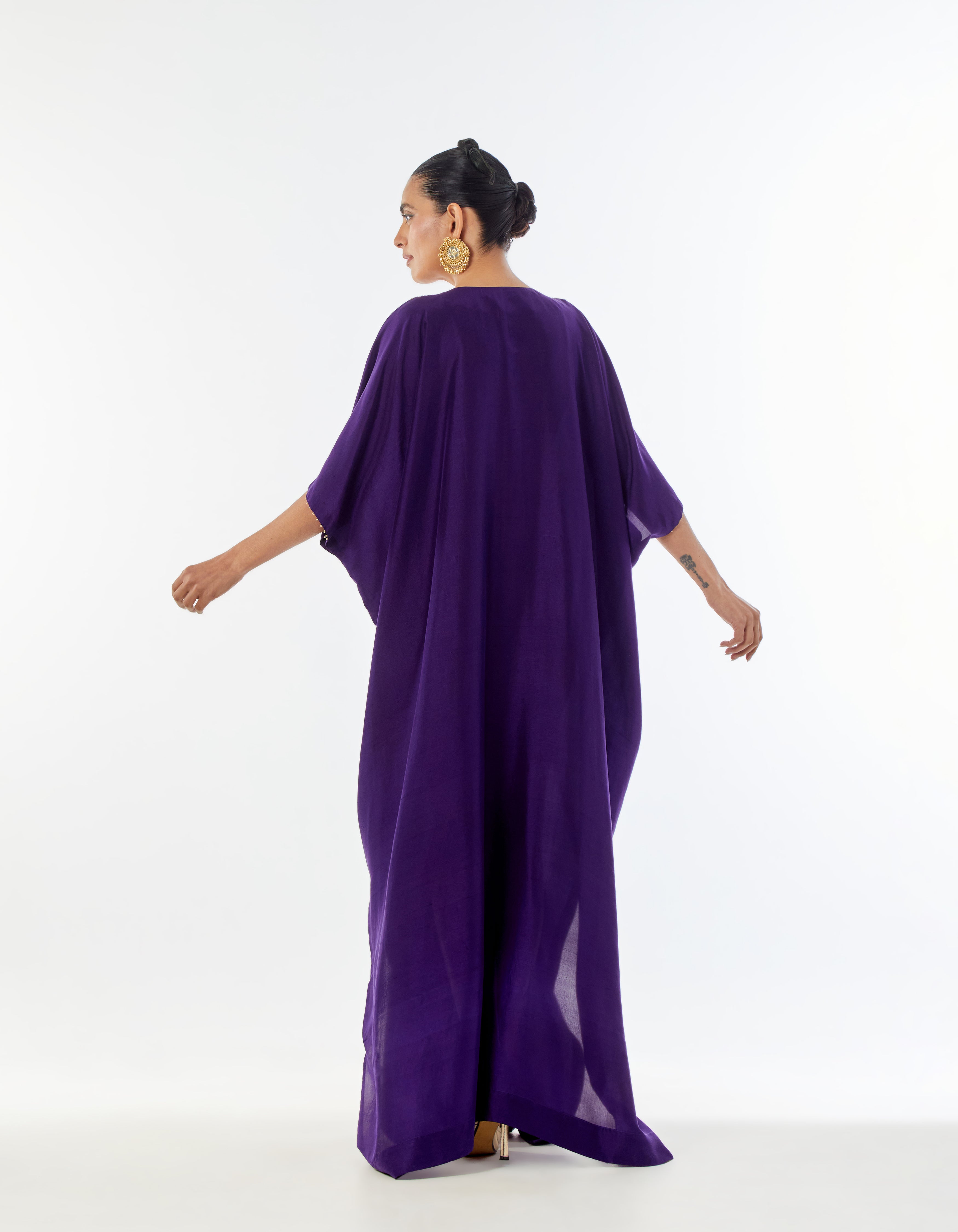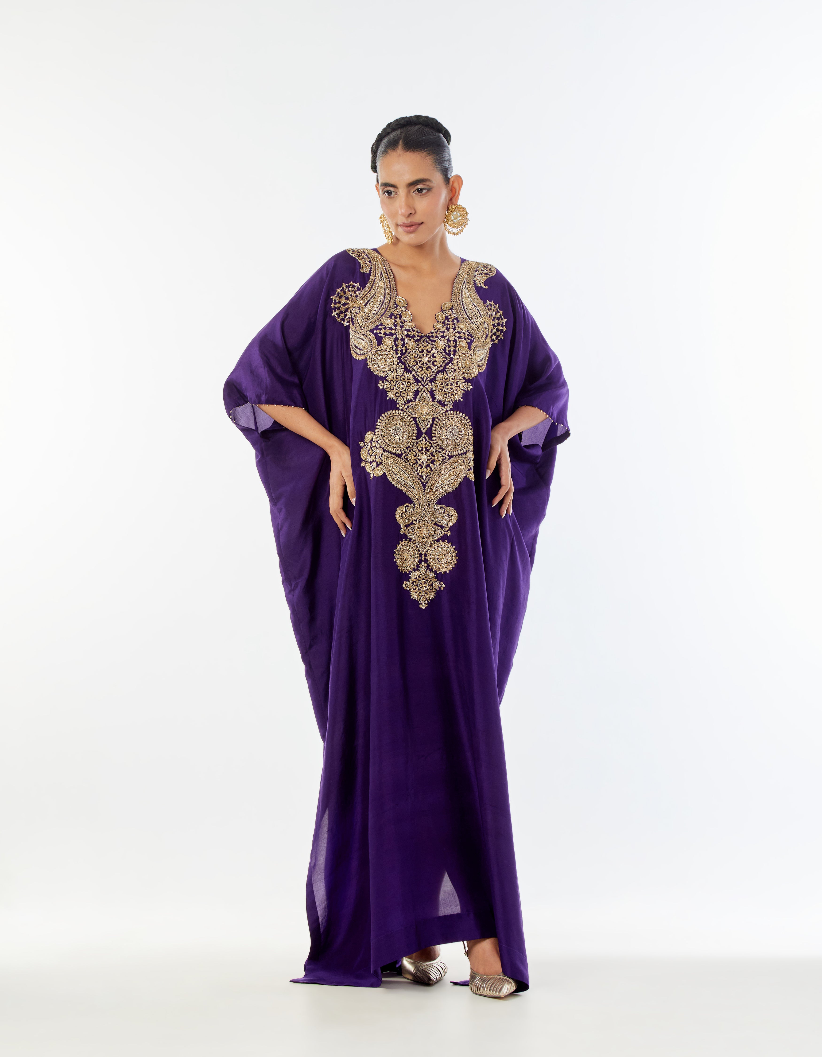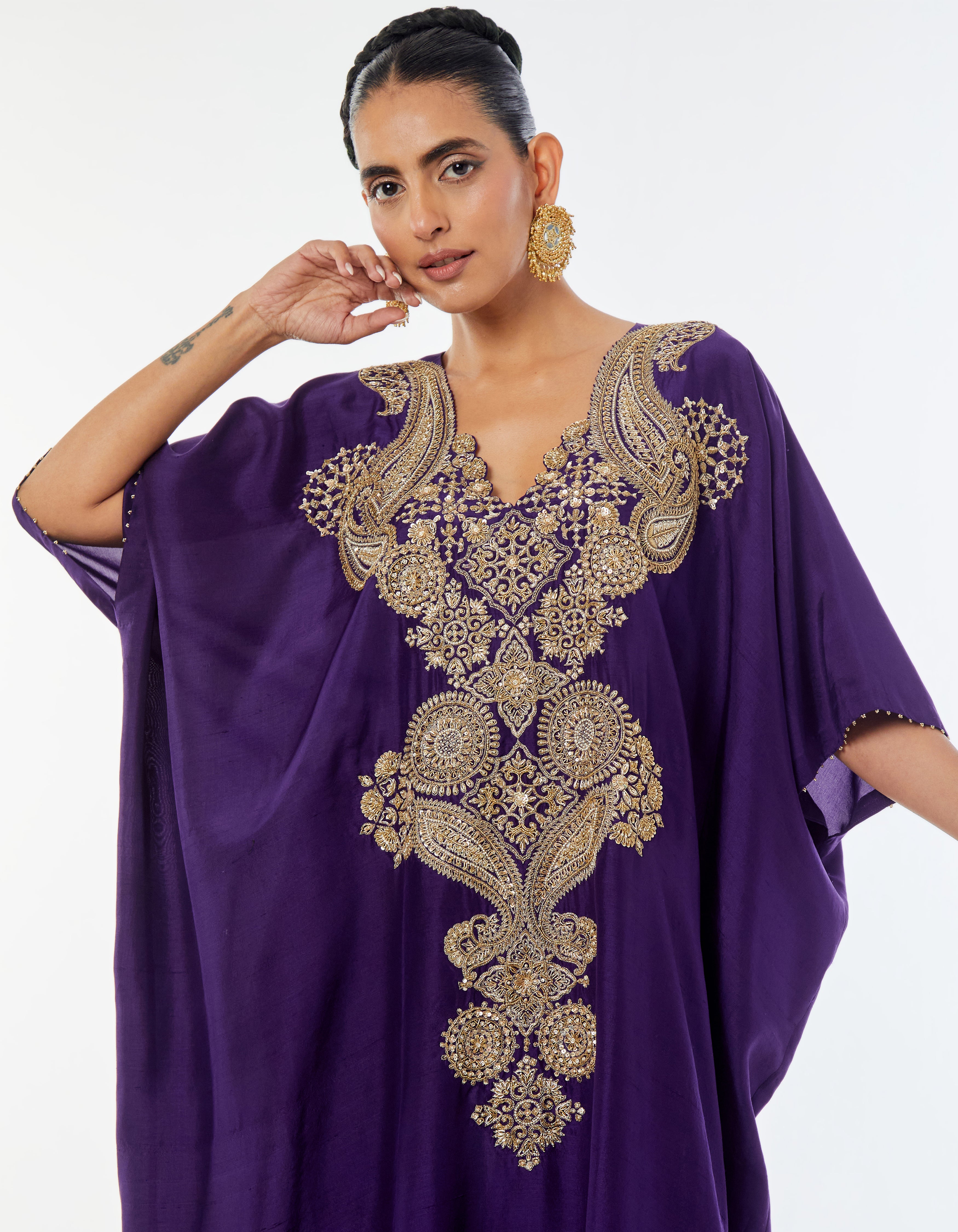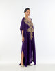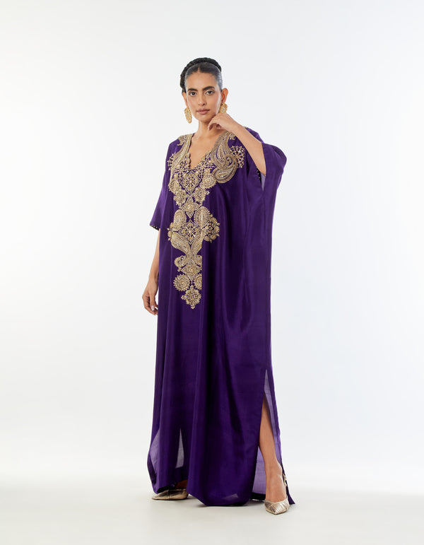 A purple silk kaftaan featuring an amalgamation of age-old paiselys and ornamental motifs, intricately embroidered in gold zardozi. Finished with delicate handmade pearl detailing at the sleeve openings.
