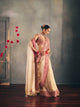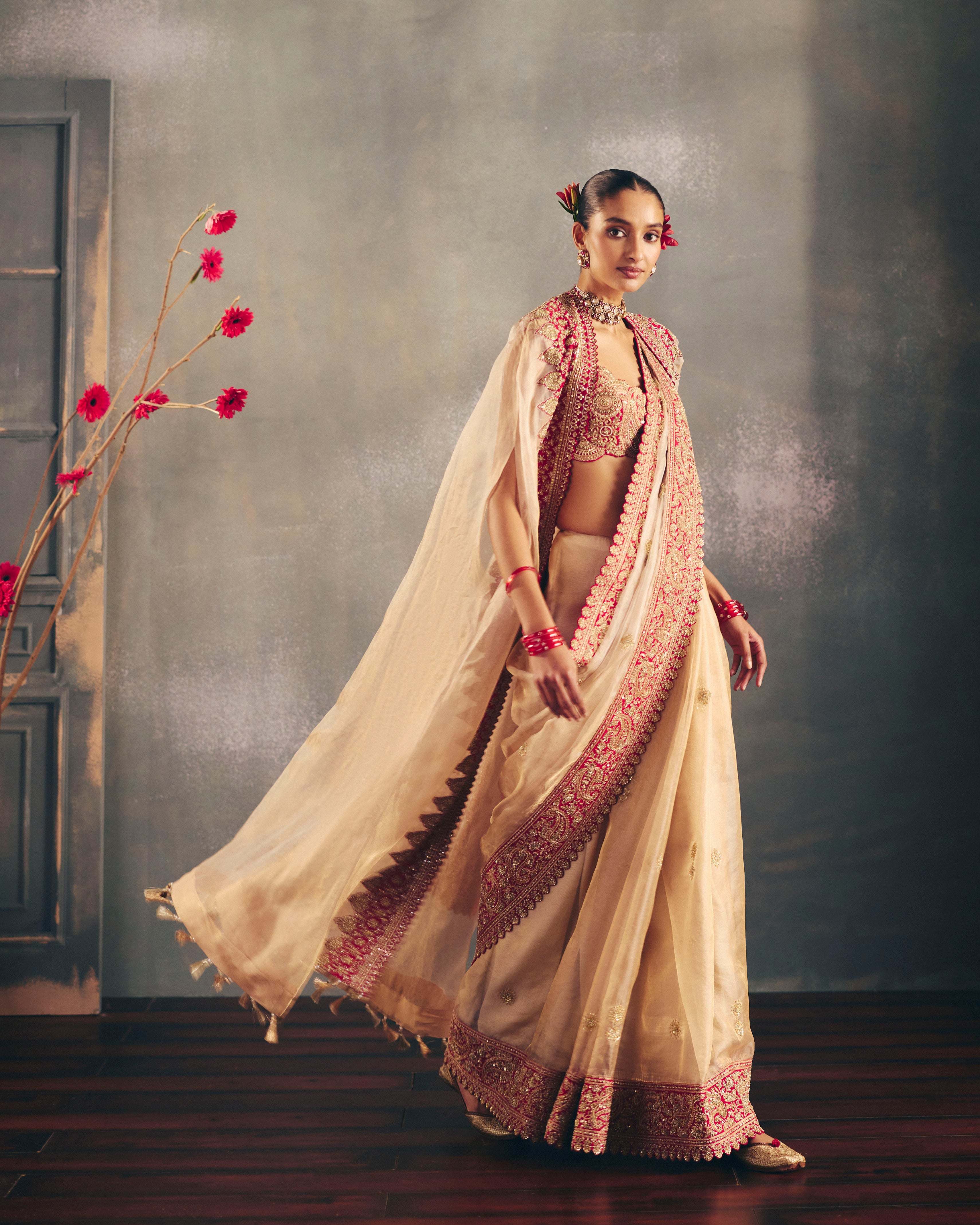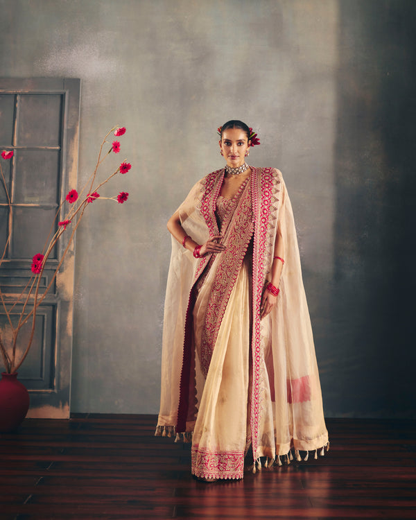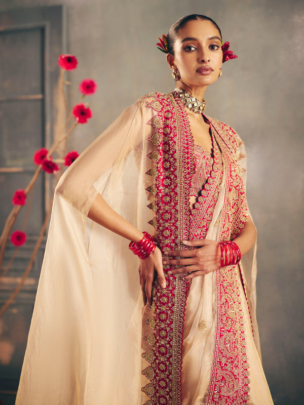 A gold tissue cape adorned with an intricately hand-embroidered linear border on contrast red silk, precisely appliquéd to create a striking interplay of textures. The hem is finished with delicate zari tassels and pearls.