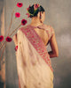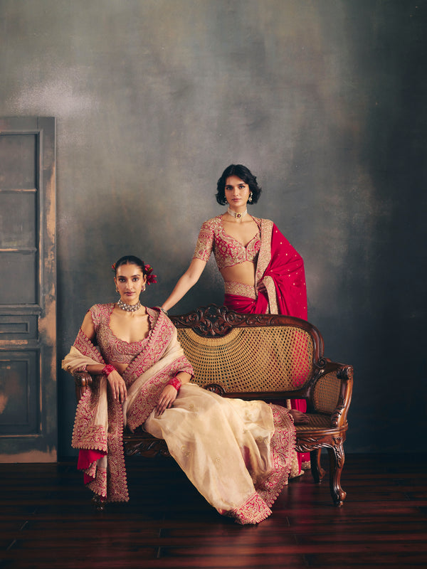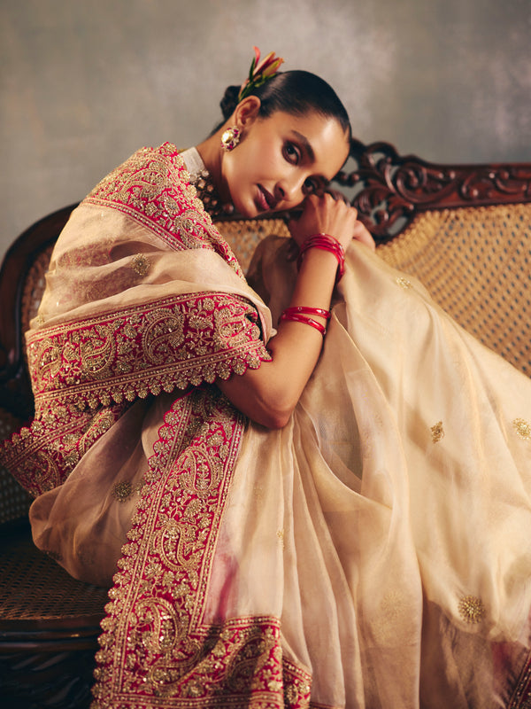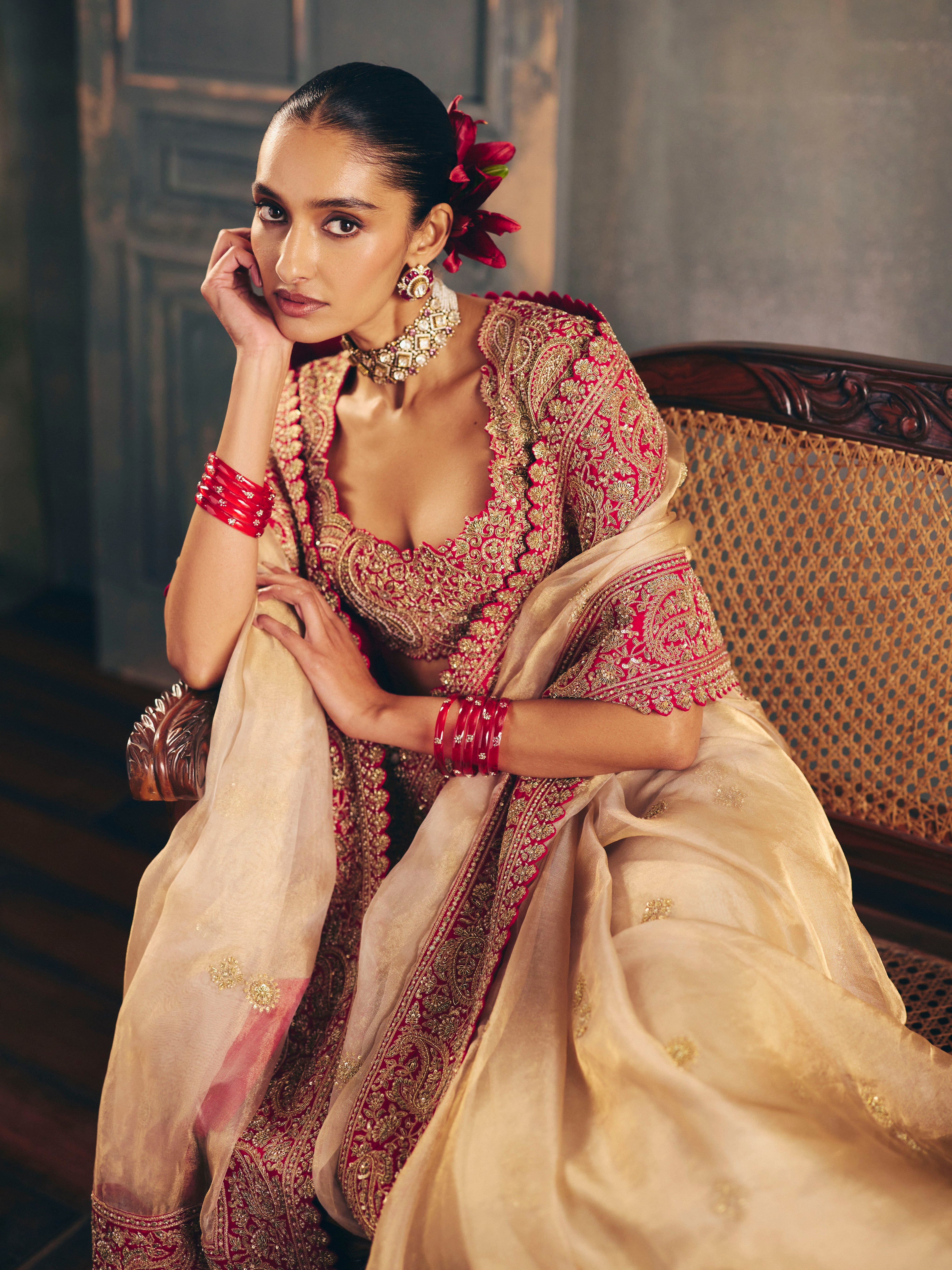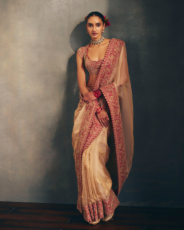 A gold tissue saree adorned with ornamental motifs across the body, framed by an intricately hand-embroidered zardozi border on contrast red raw silk, crafted with intricate paisley motifs and floral jaal artwork. Paired with a red pot-neck blouse, meticulously embroidered in zardozi with ornamental motifs and signature paisleys, finished with cap sleeves.