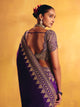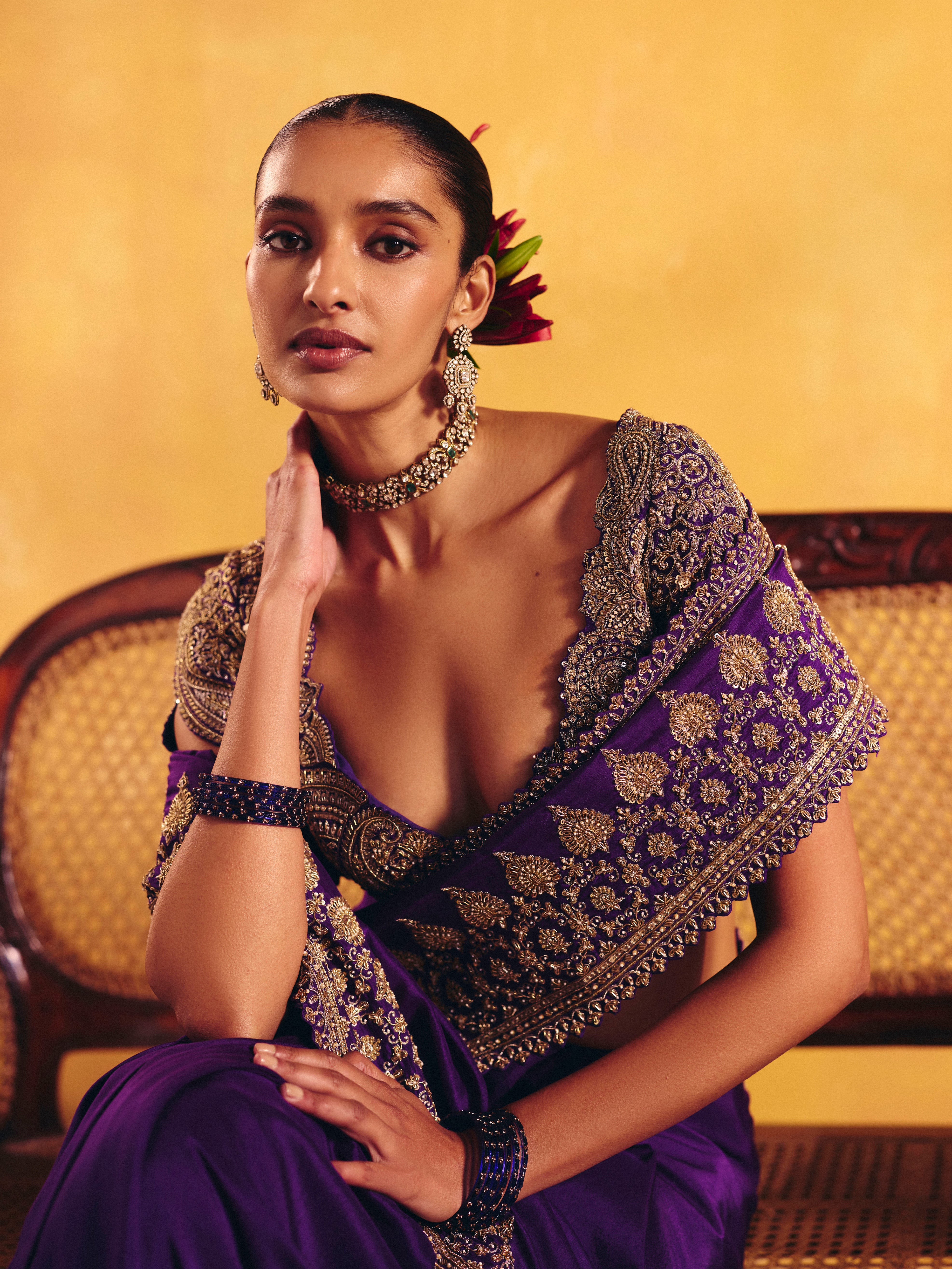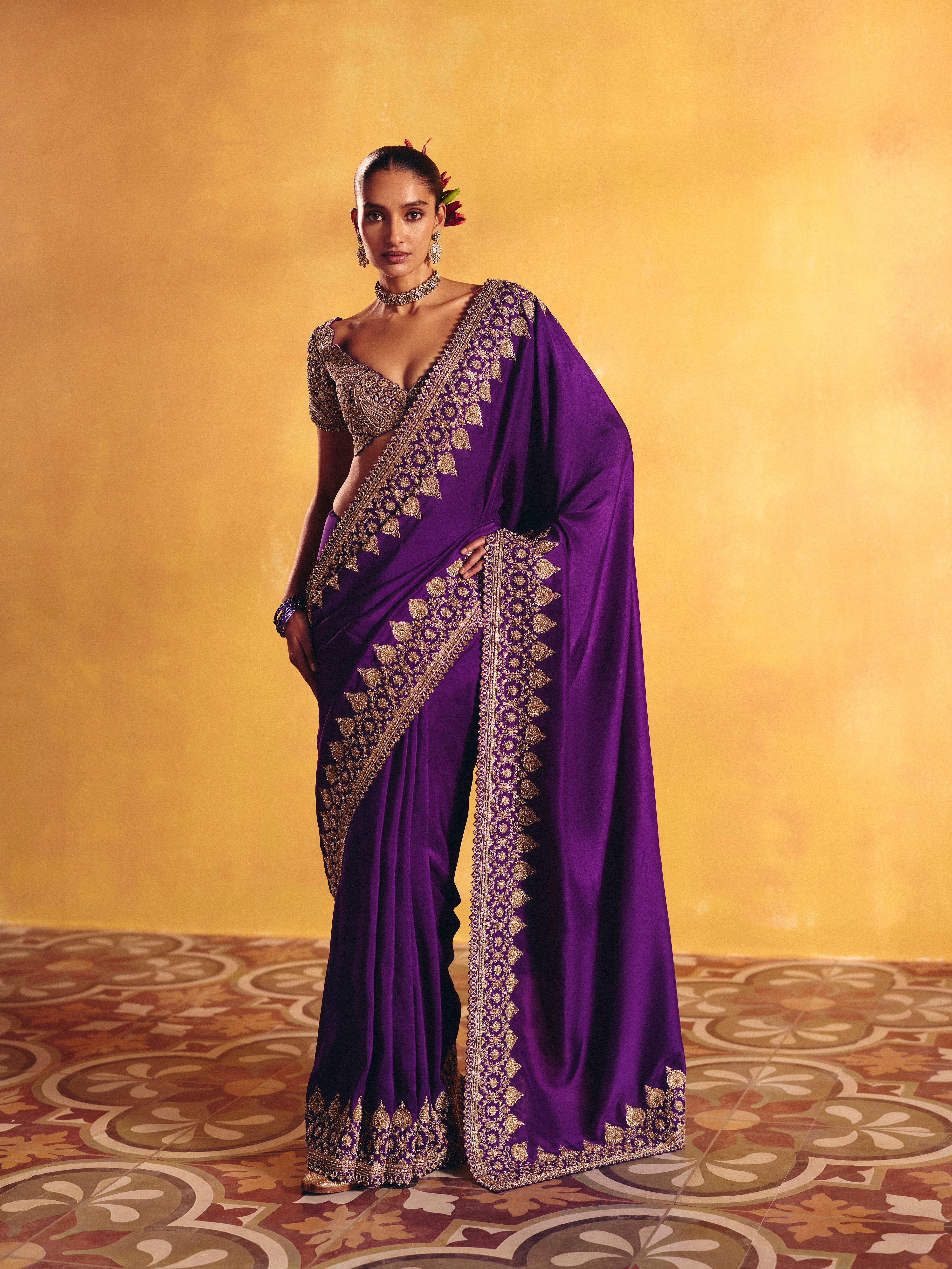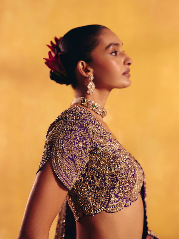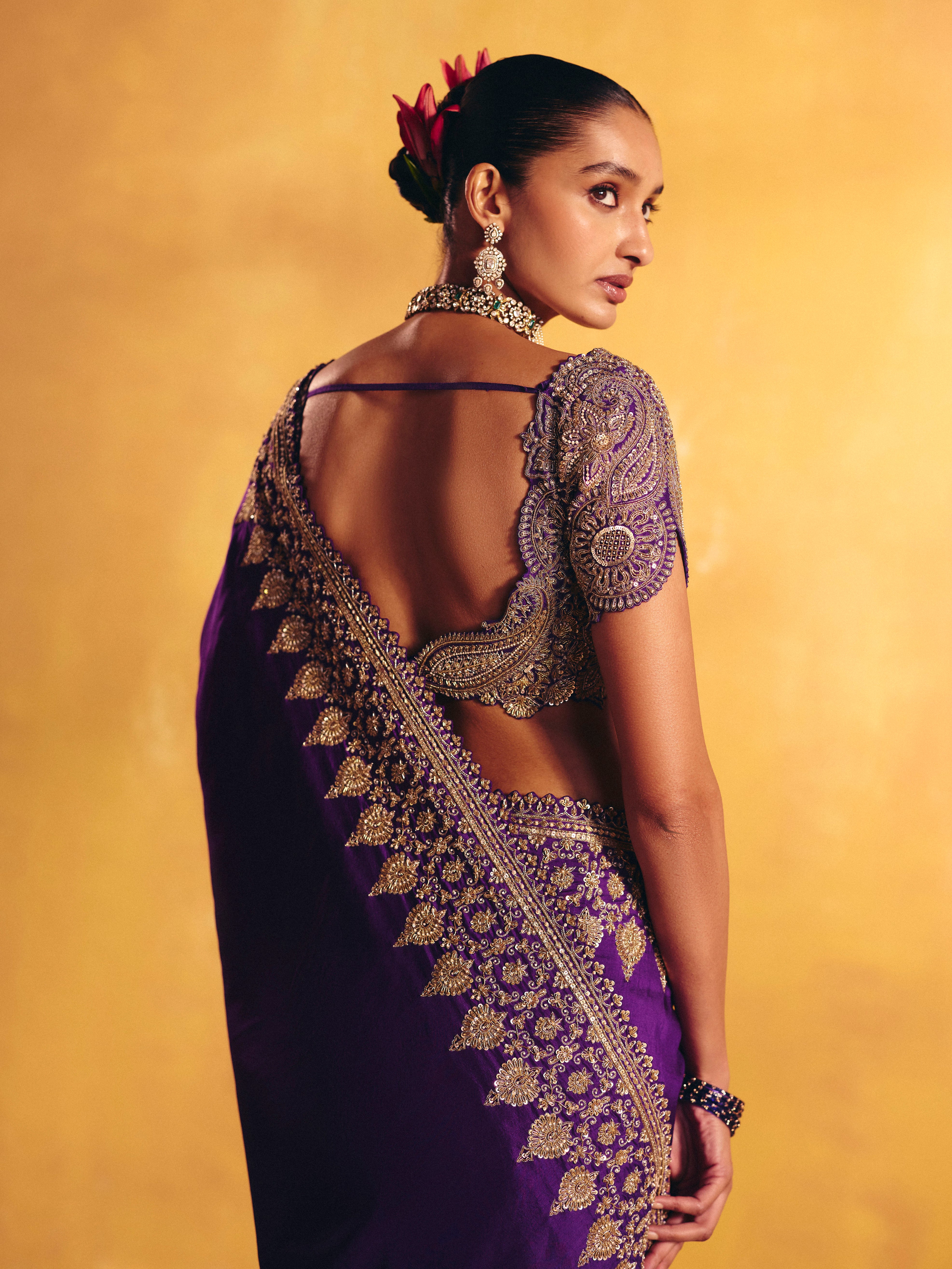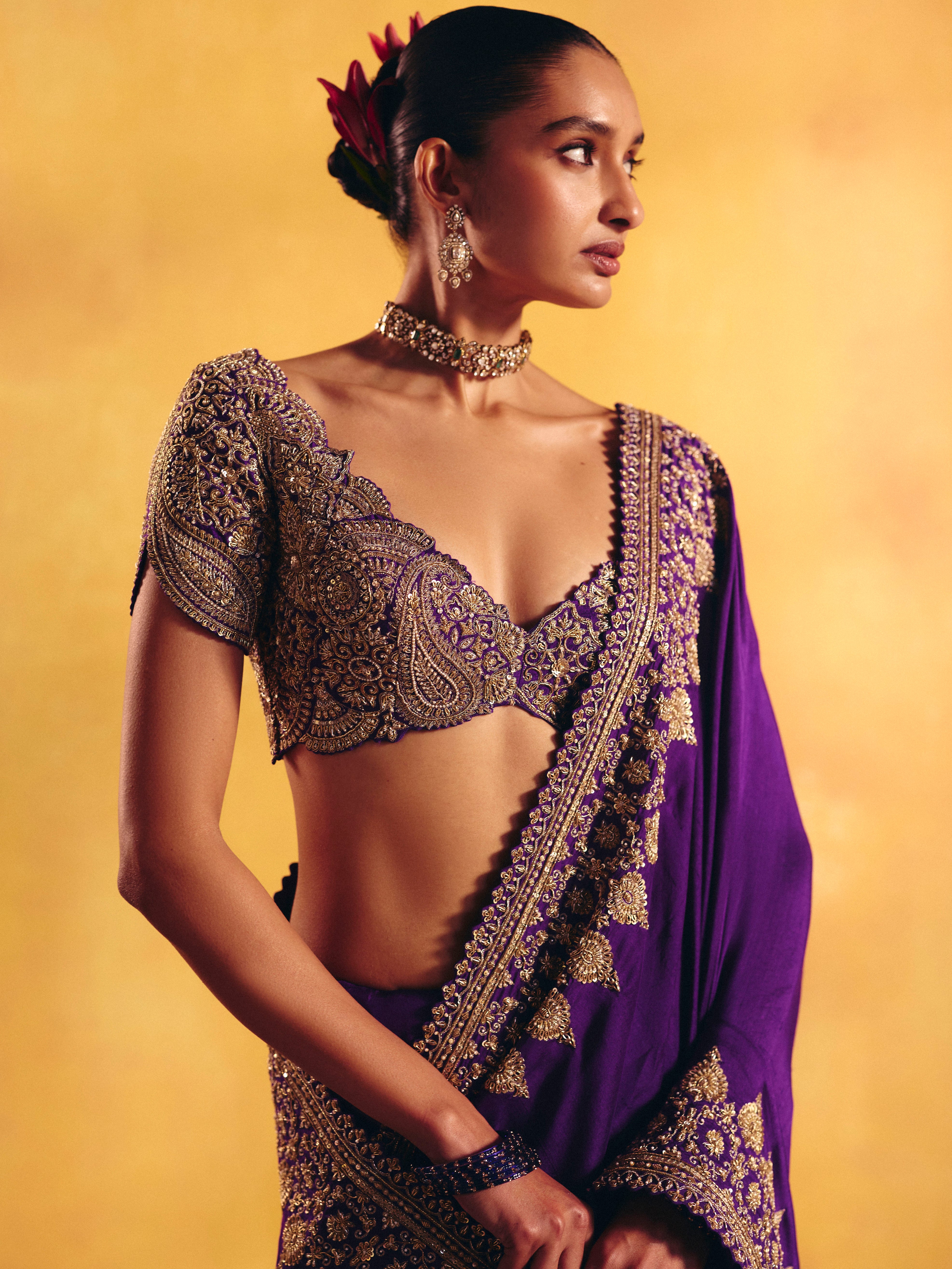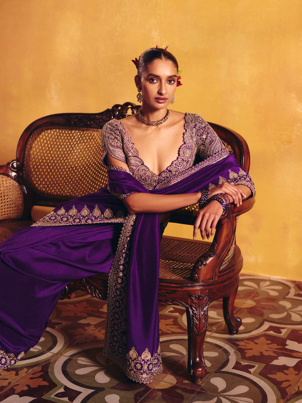 A purple silk saree featuring an intricate linear zardozi border. Paired with a rounded V-neck raw silk blouse, meticulously hand-embroidered in zardozi with ornamental motifs and signature paisleys, and finished with delicately scalloped sleeves.