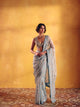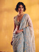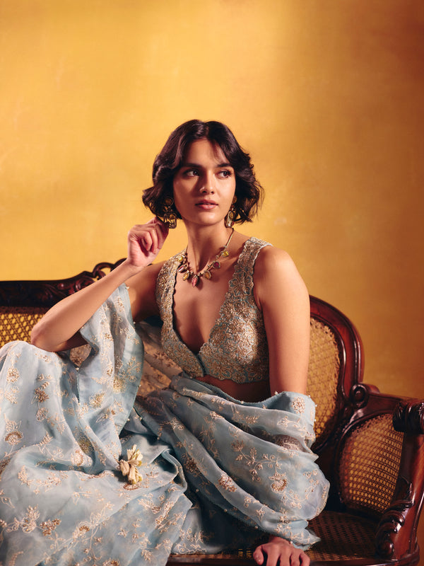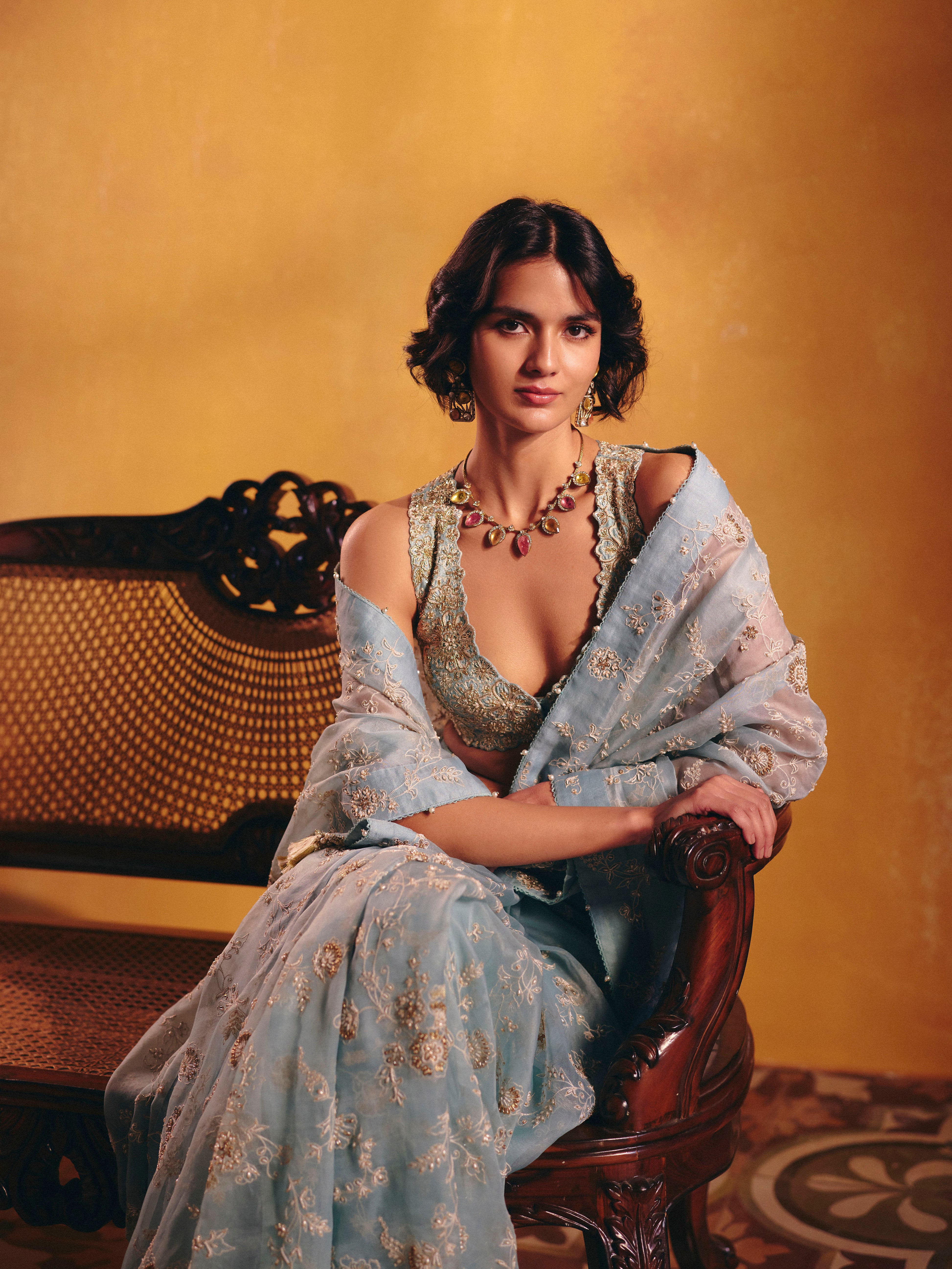 A ice blue organza saree with an intricate floral jaal in ivory resham embroidered throughout the saree, highlighted with zardozi and pearl work. Finished with pearls along the saree edges and hand-made zari and thread tassels on pallu corners. Paired with a racer back blouse, adorned with floral artwork in zardozi and ivory resham embroidery.