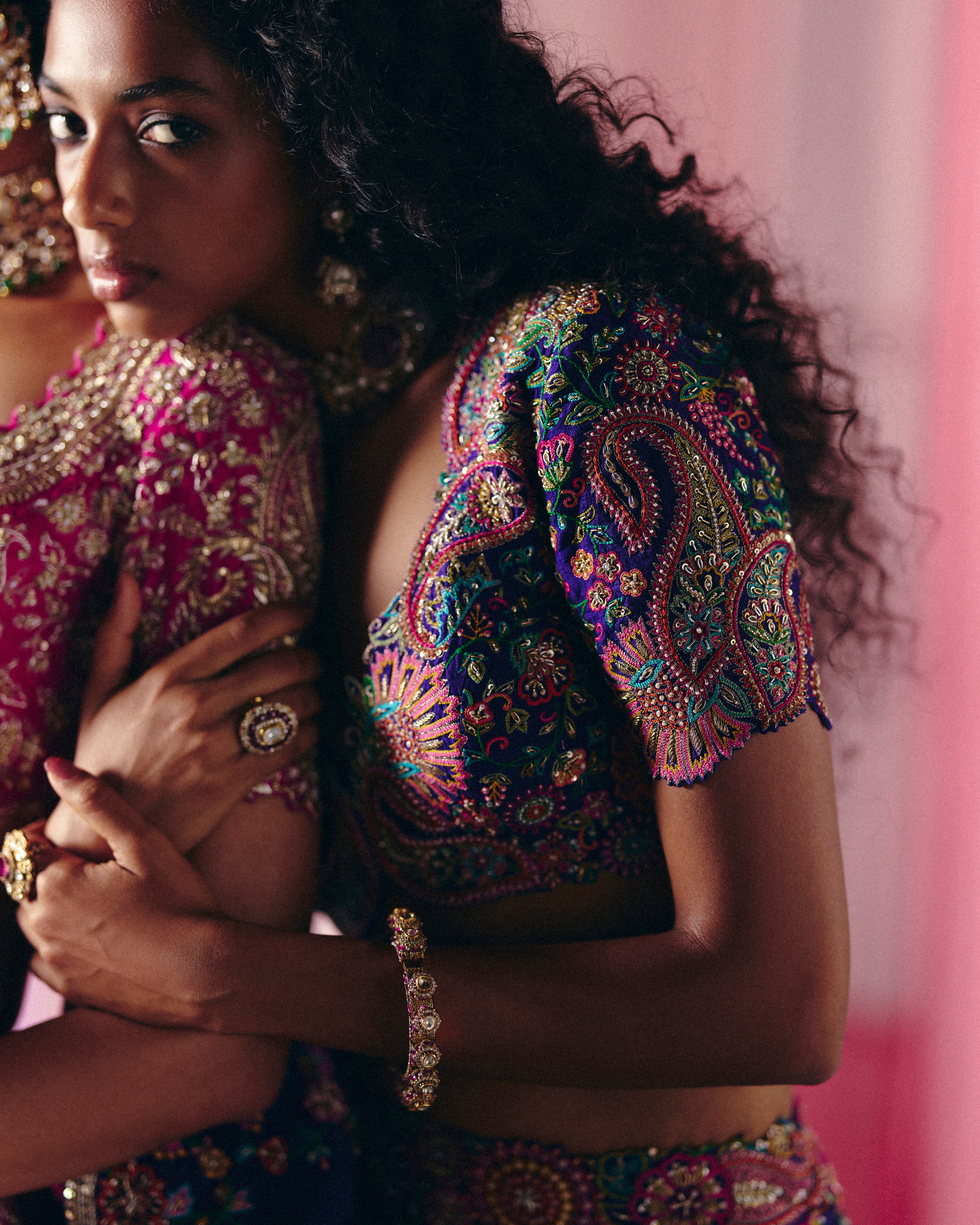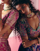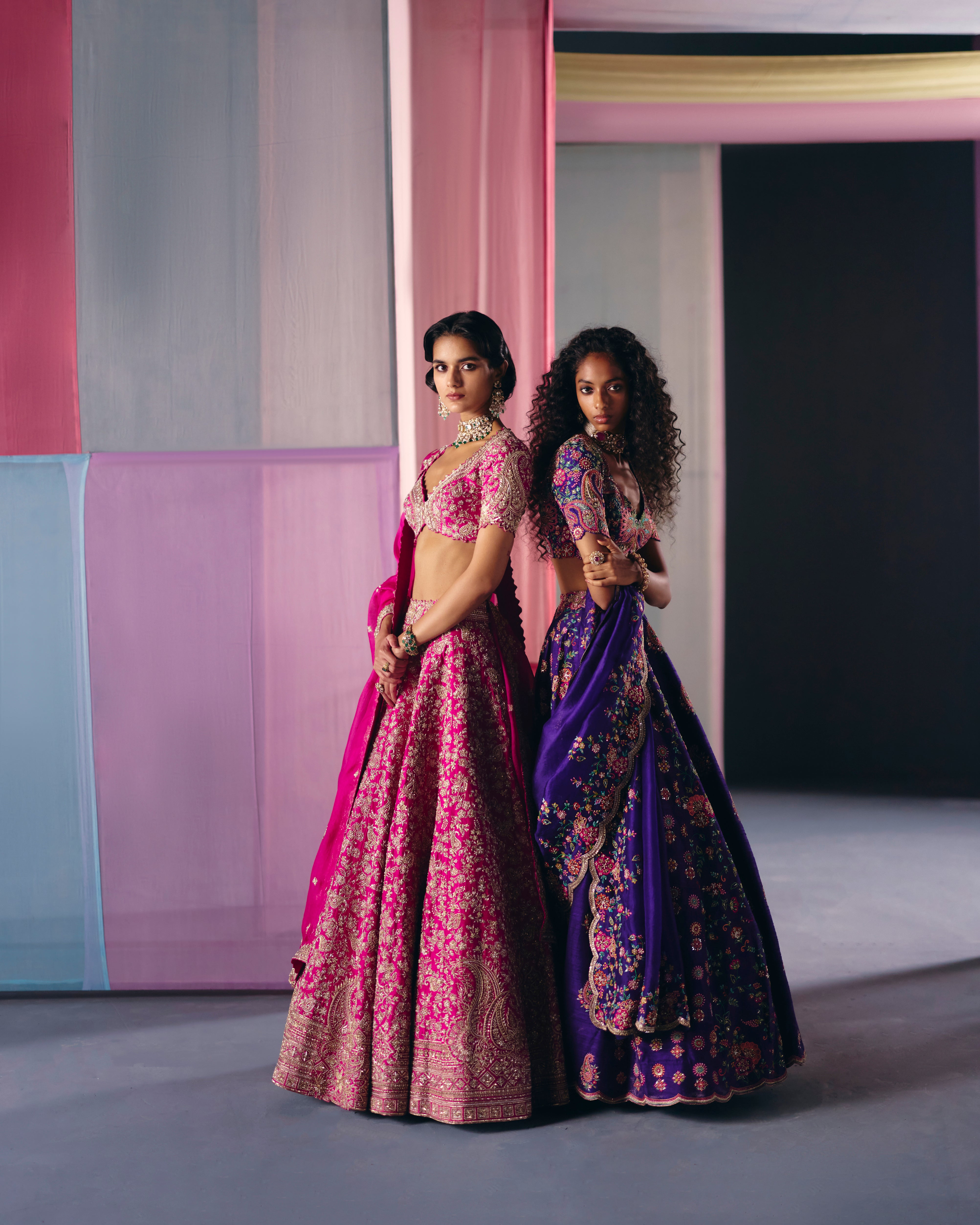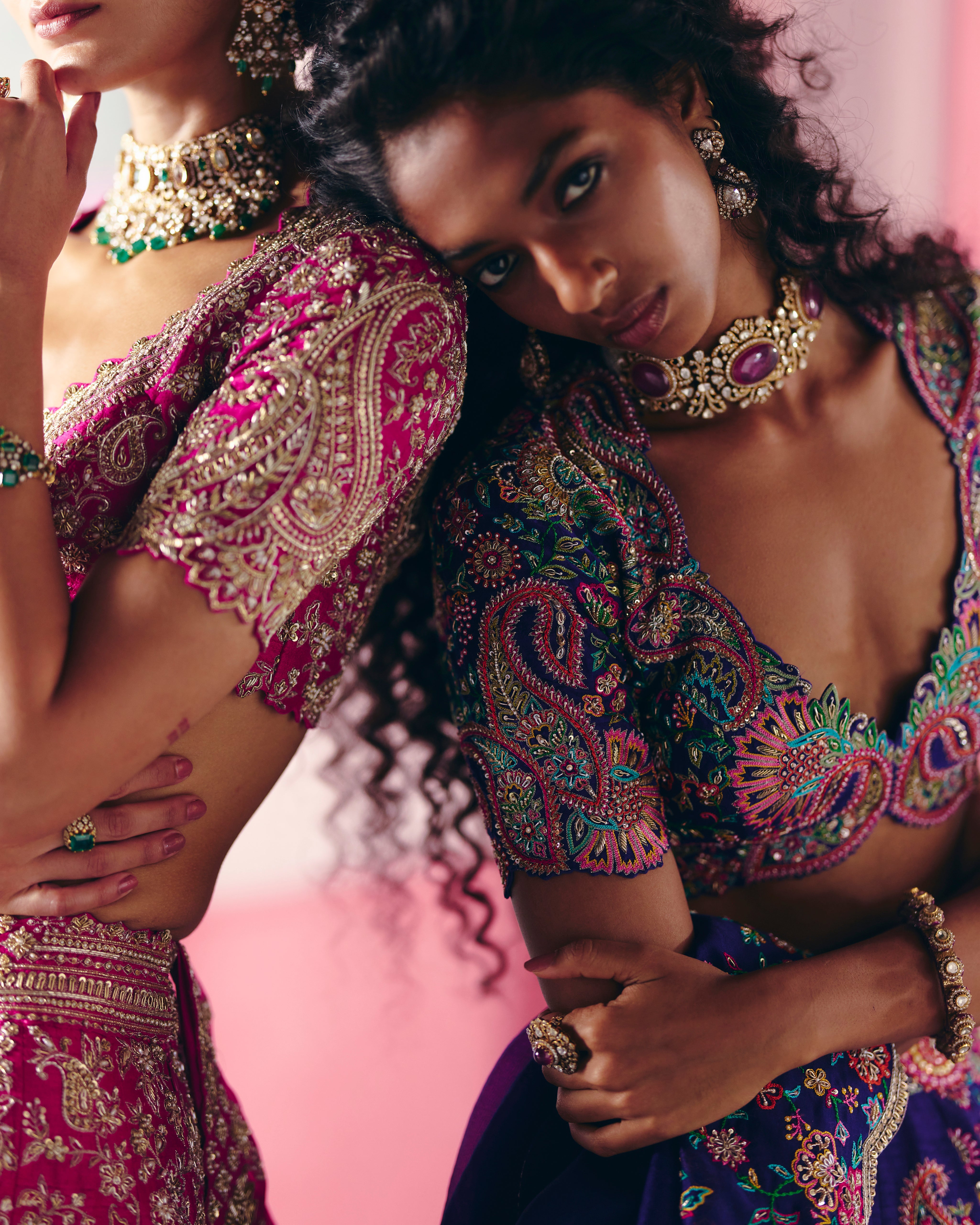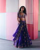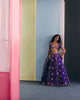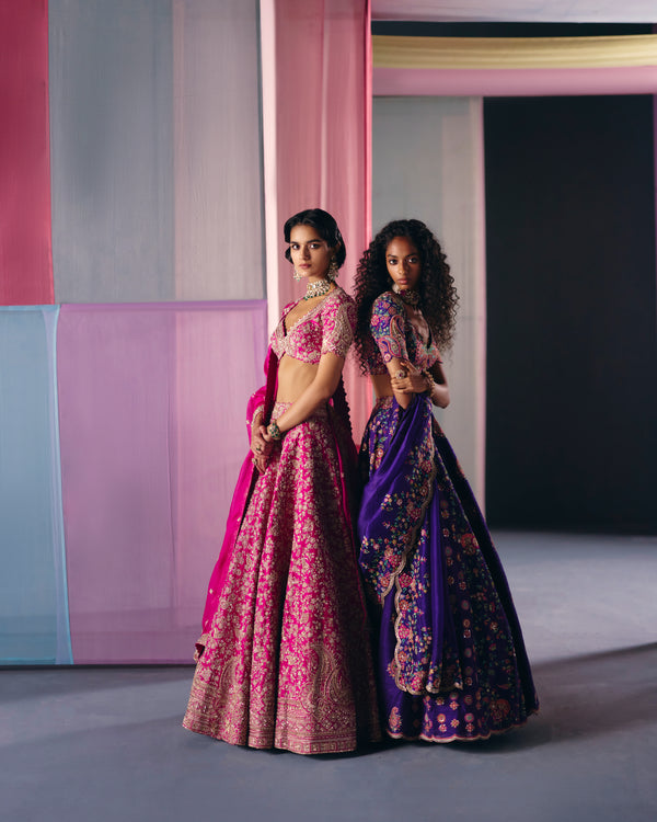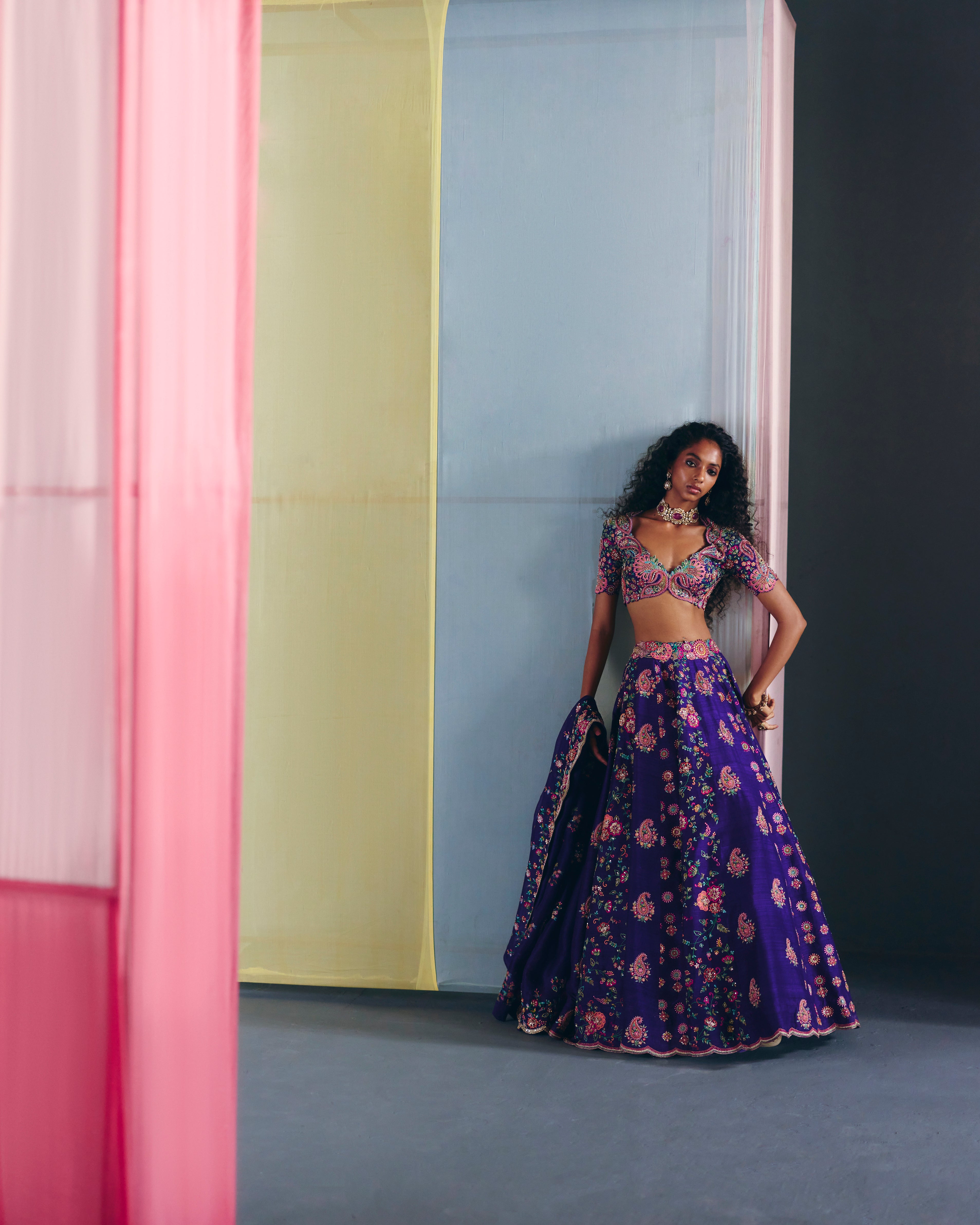 A purple raw silk lehenga crafted with three unique artworks—paisleys, geometric buttas, and intricate jaal—arranged in alternating panels and finished with a scalloped border. Hand-embroidered with multicolored resham and zardozi, it is paired with a raw silk blouse and an organza dupatta featuring intricate jaal along the scalloped border.
