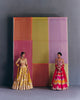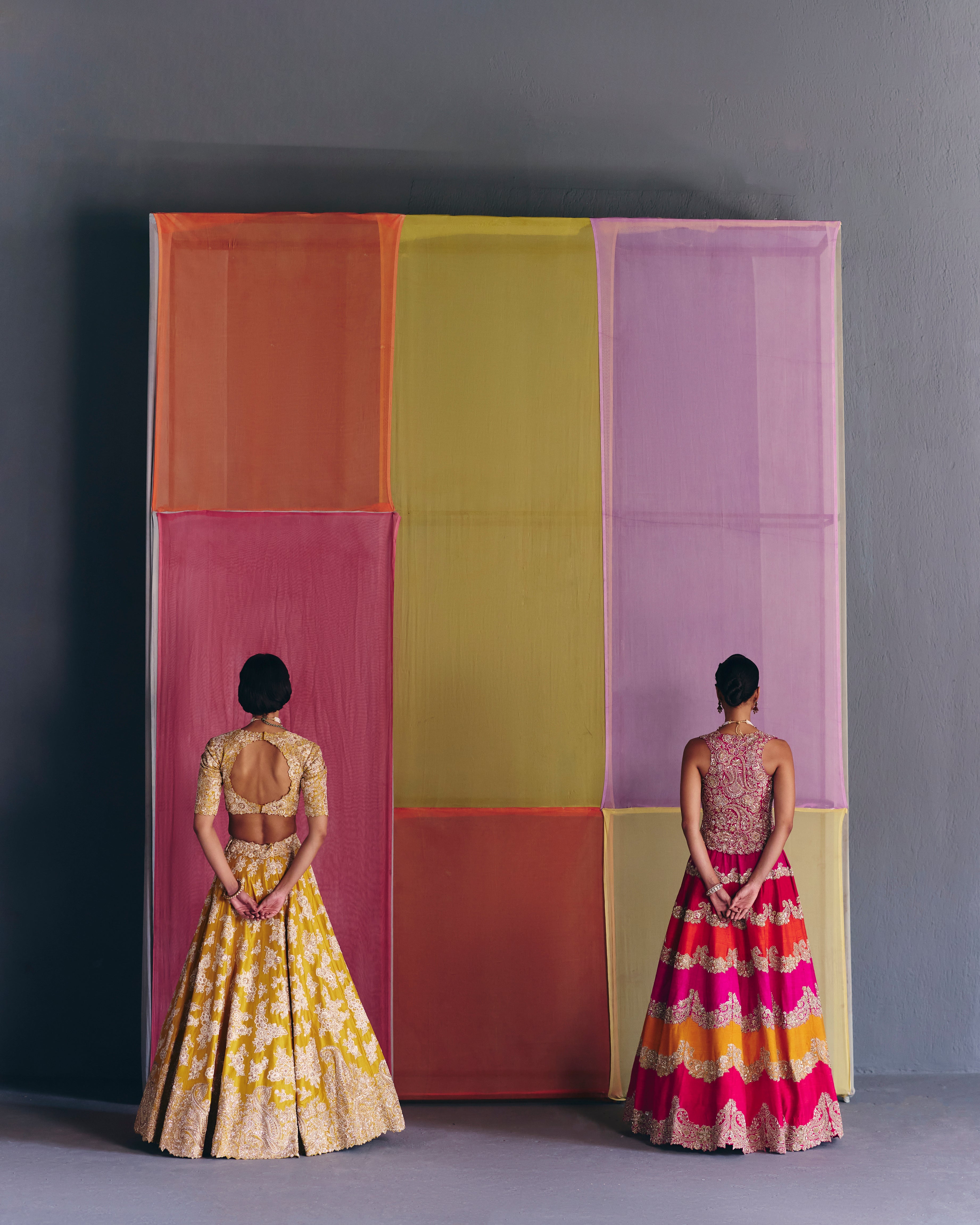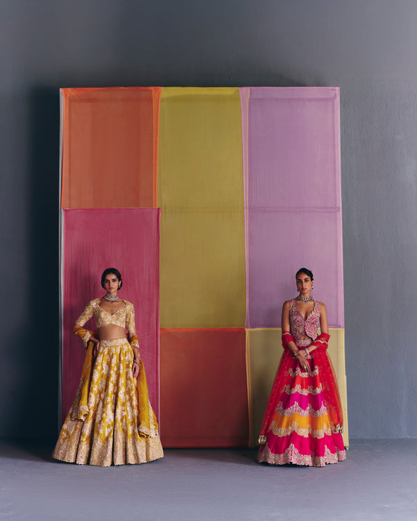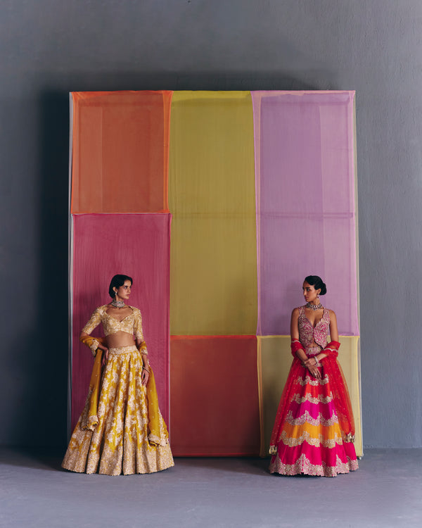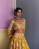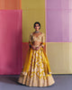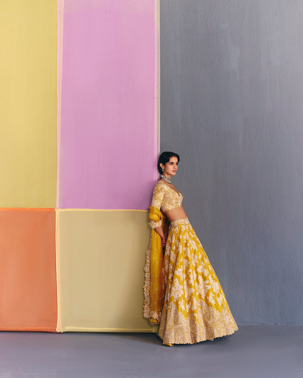 A yellow silk lehenga adorned with ornate paisleys along the border and contemporary floral bunches artistically placed across the silhouette. Crafted in ivory resham, pearls, and zardozi embroidery. Paired with a raw silk blouse featuring pleated sleeves and an organza dupatta.