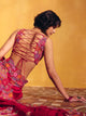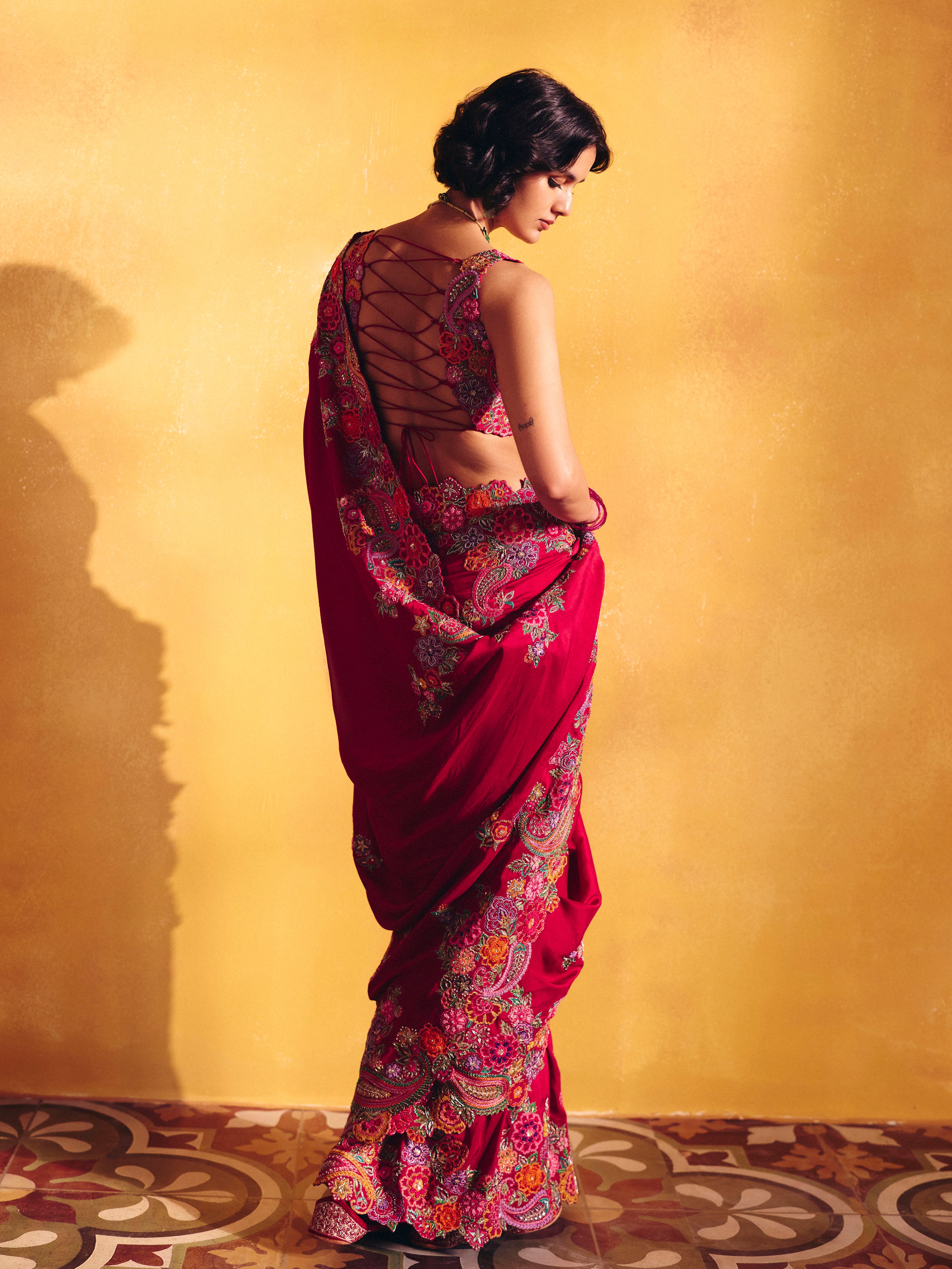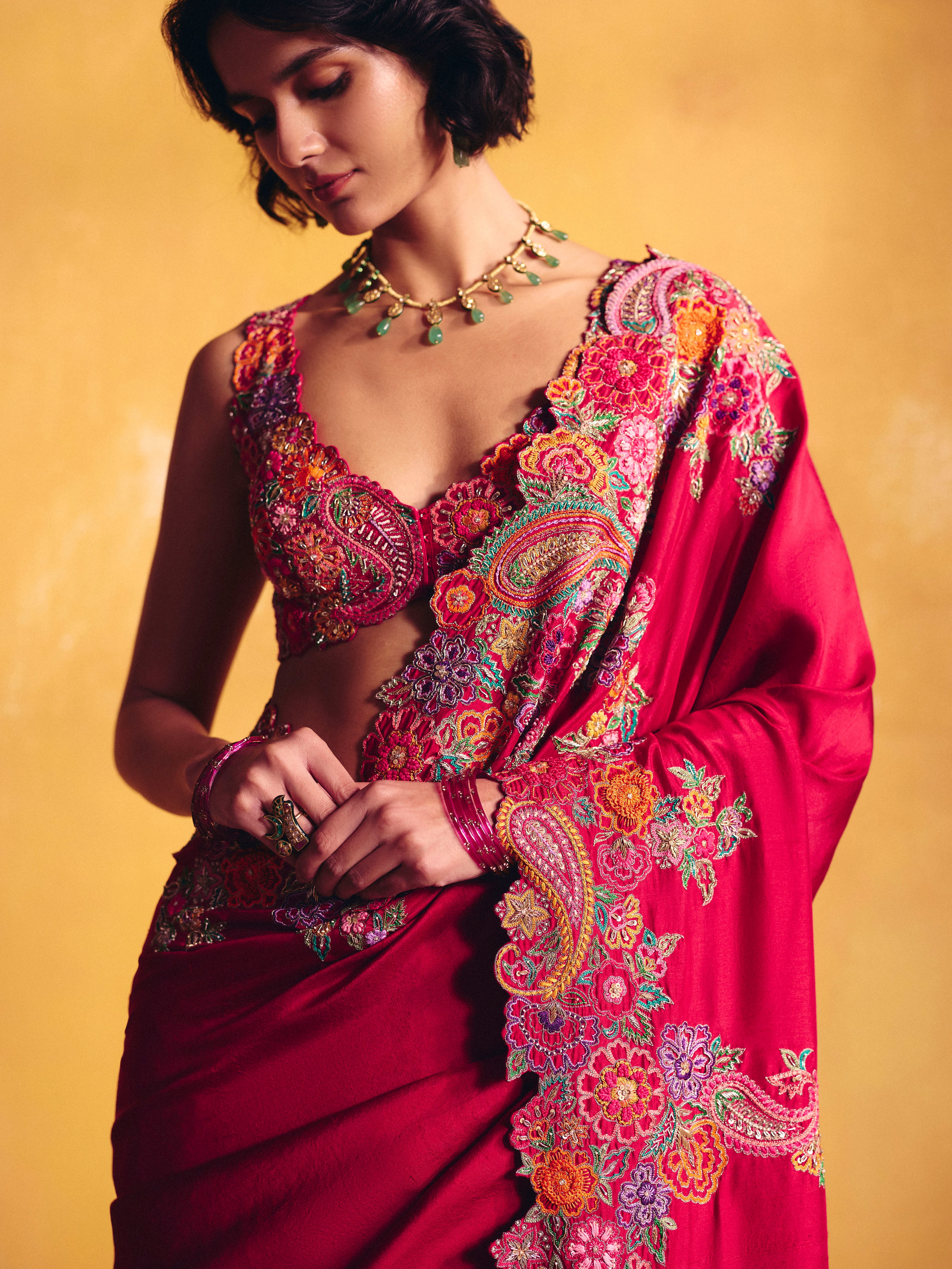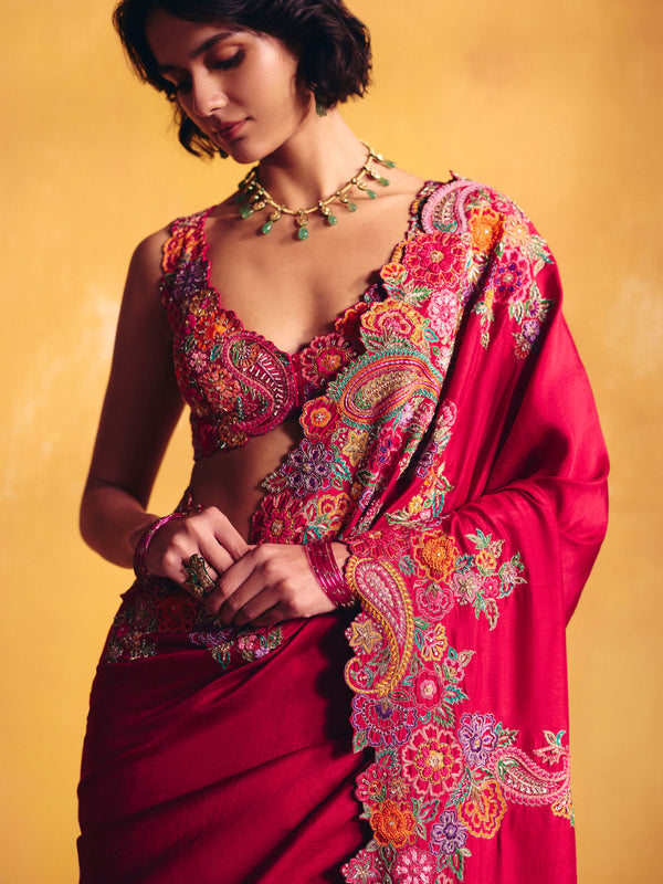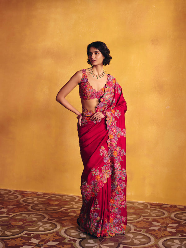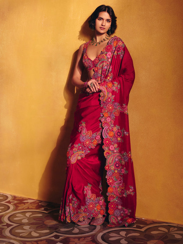 A red silk saree featuring signature paisleys and floral motifs artistically placed along the border, accented with multicoloured resham and zardozi. Paired with a raw silk blouse with a rounded V-neckline, detailed with the same embroidery technique showcasing contemporary floral and paisley artwork, and finished with a tie-up closure at the back.