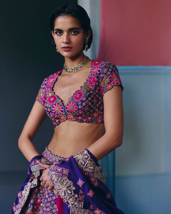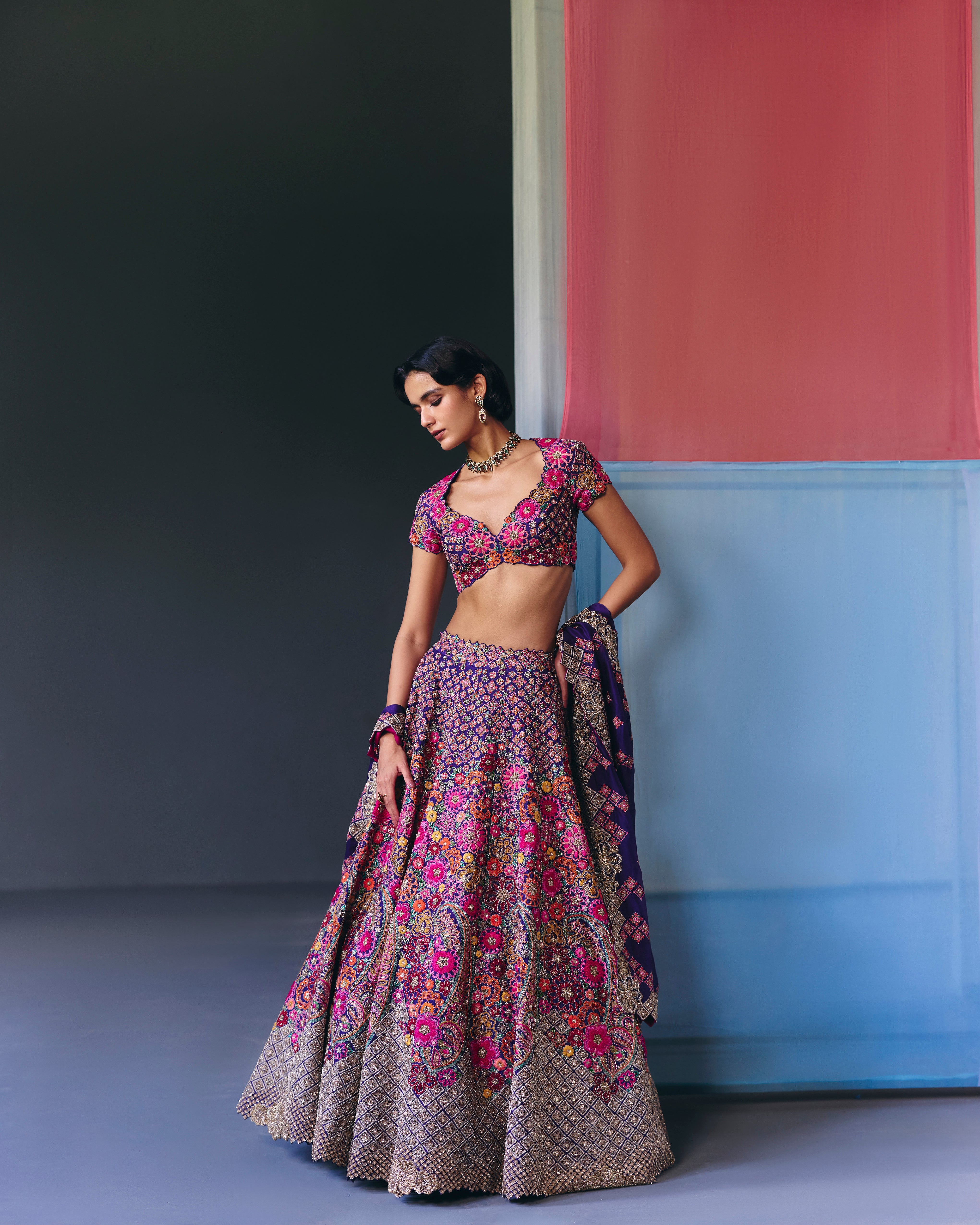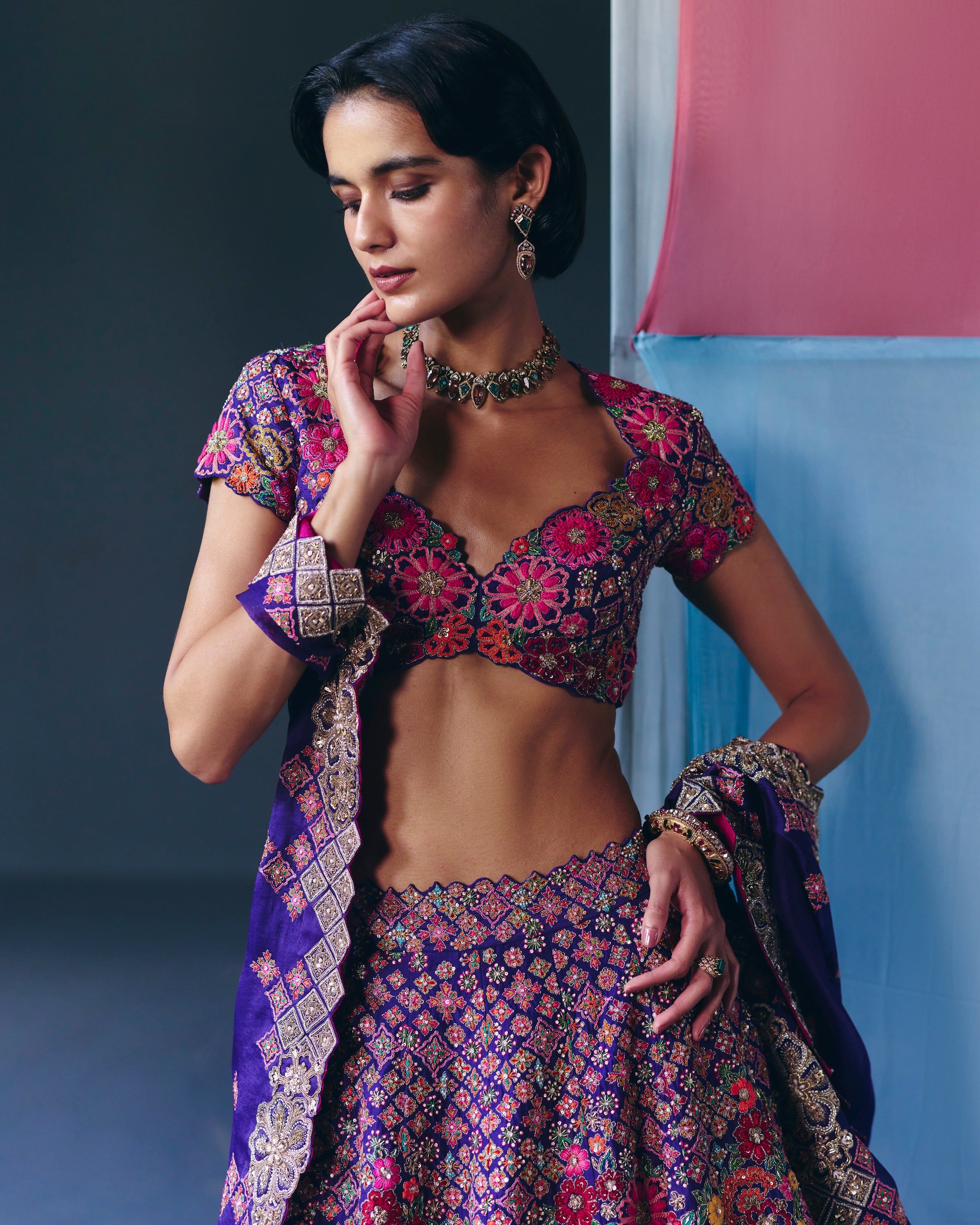 A purple silk lehenga beautifully adorned with diamond and floral motifs in zardozi embroidery, seamlessly blending into multicolored resham-embroidered paisleys and floral artwork. It is paired with a raw silk blouse and an organza dupatta.