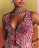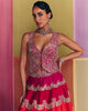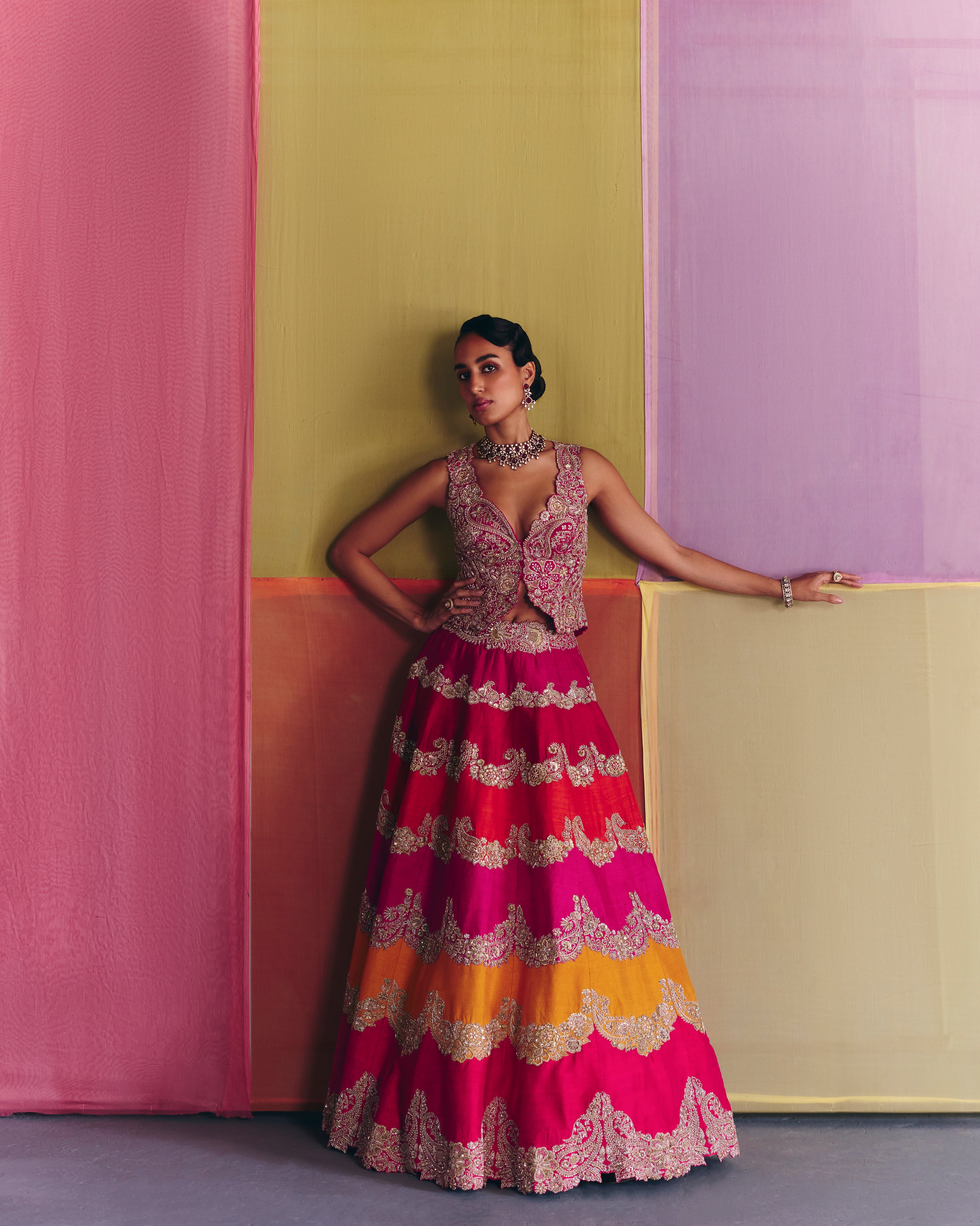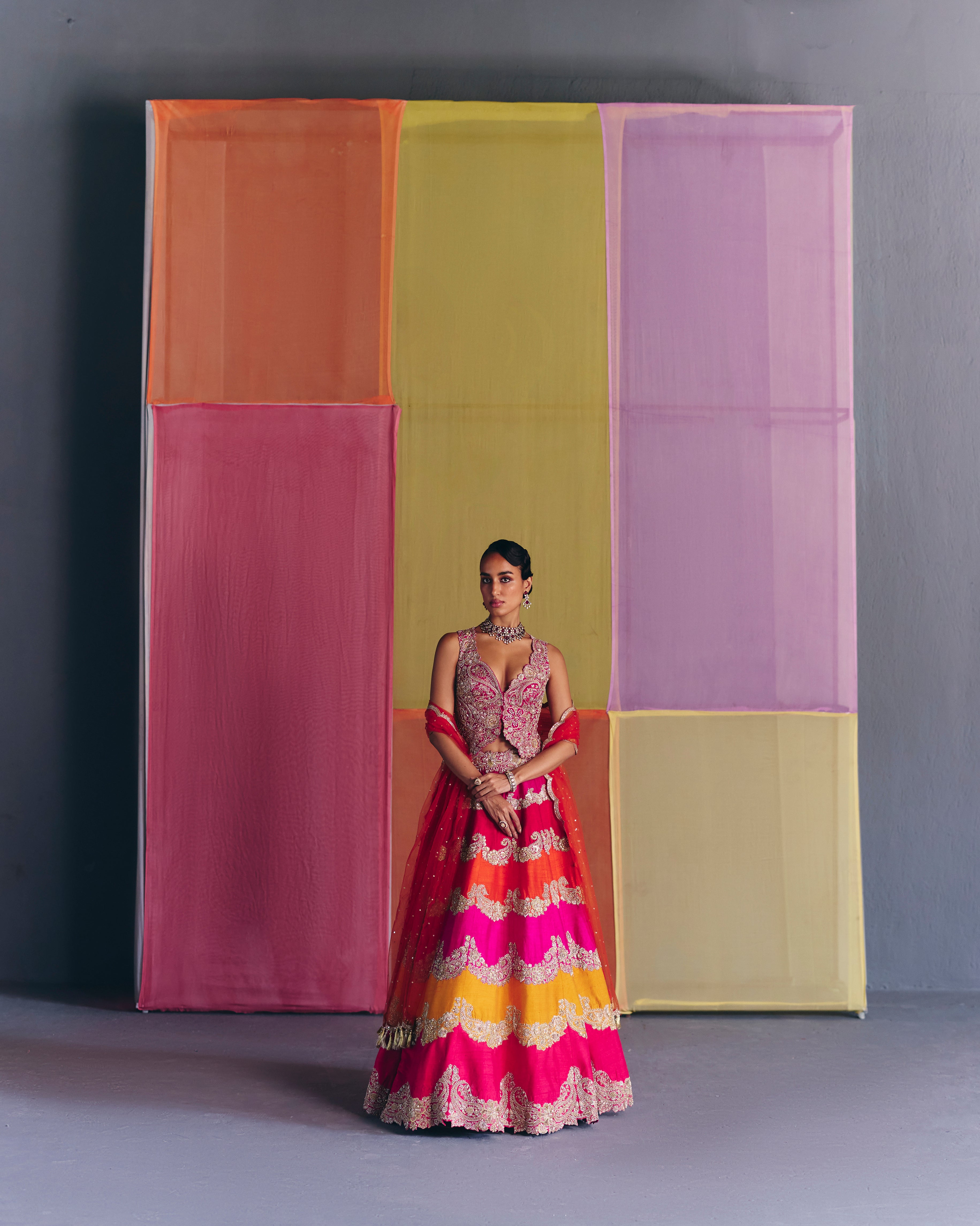 A raw silk lehenga artistically crafted in six shades of pink, red, orange, and yellow. Adorned with paisley and floral artwork in zardozi, placed between the colors to seamlessly blend the shades. It is paired with a dark pink raw silk waistcoat, hand-embroidered in zardozi, and an orange net dupatta featuring hand-embroidered scallops and scattered cheetahs that complement the lehenga. The dupatta is finished with pearls and hand-made tassels.