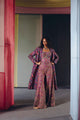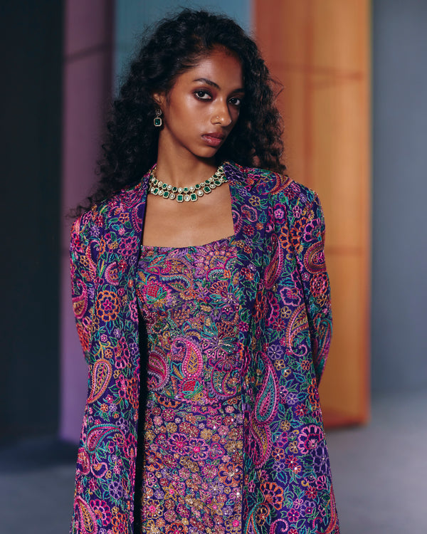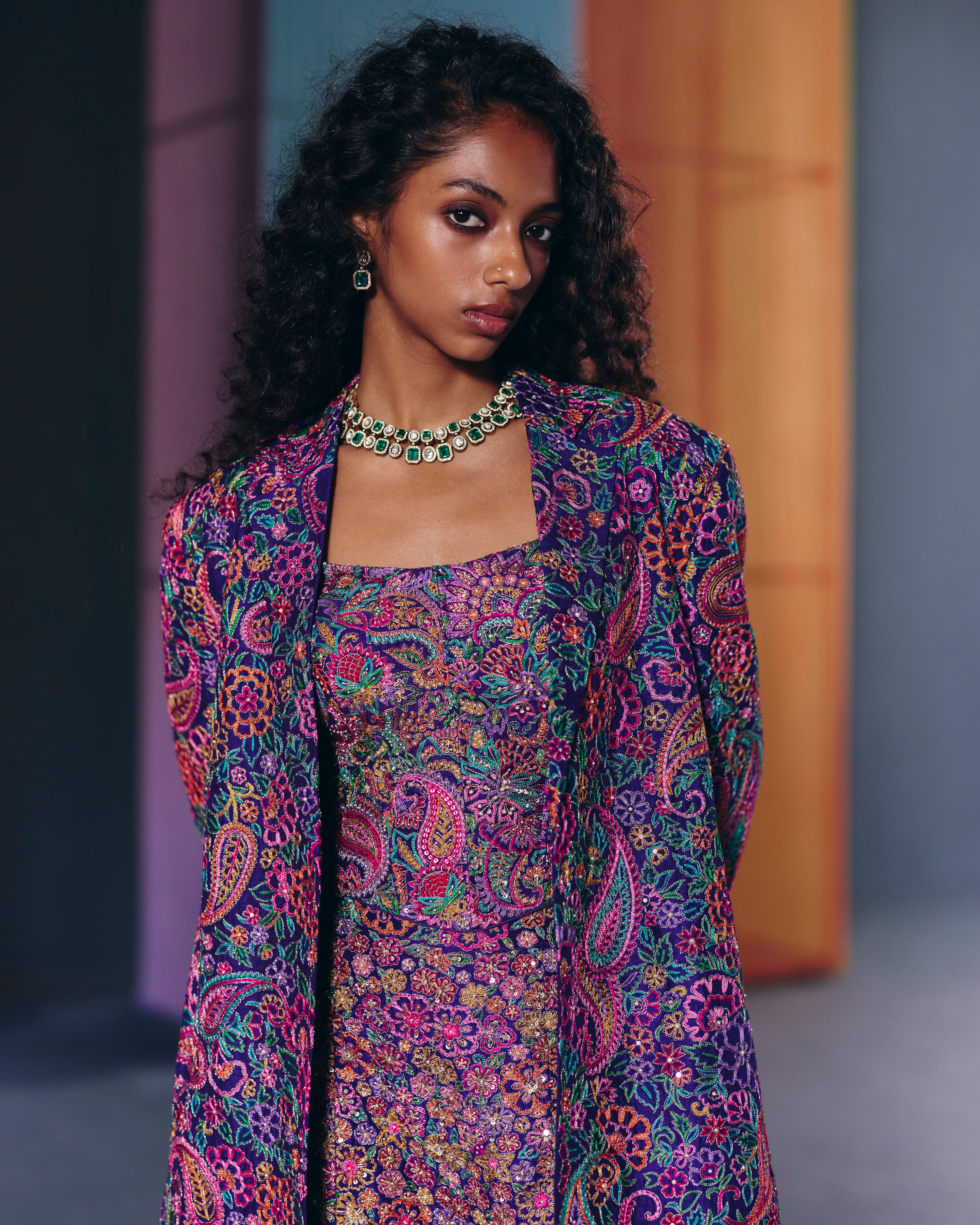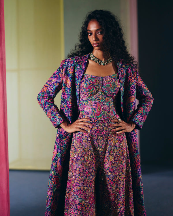 Purple silk flared pants adorned with ornate floral motifs and signature paisleys along the border, seamlessly blending into contemporary flowers, embroidered in multicolored resham and zardozi. Paired with a raw silk corset and trench coat embellished with paisleys and ornate floral motifs.