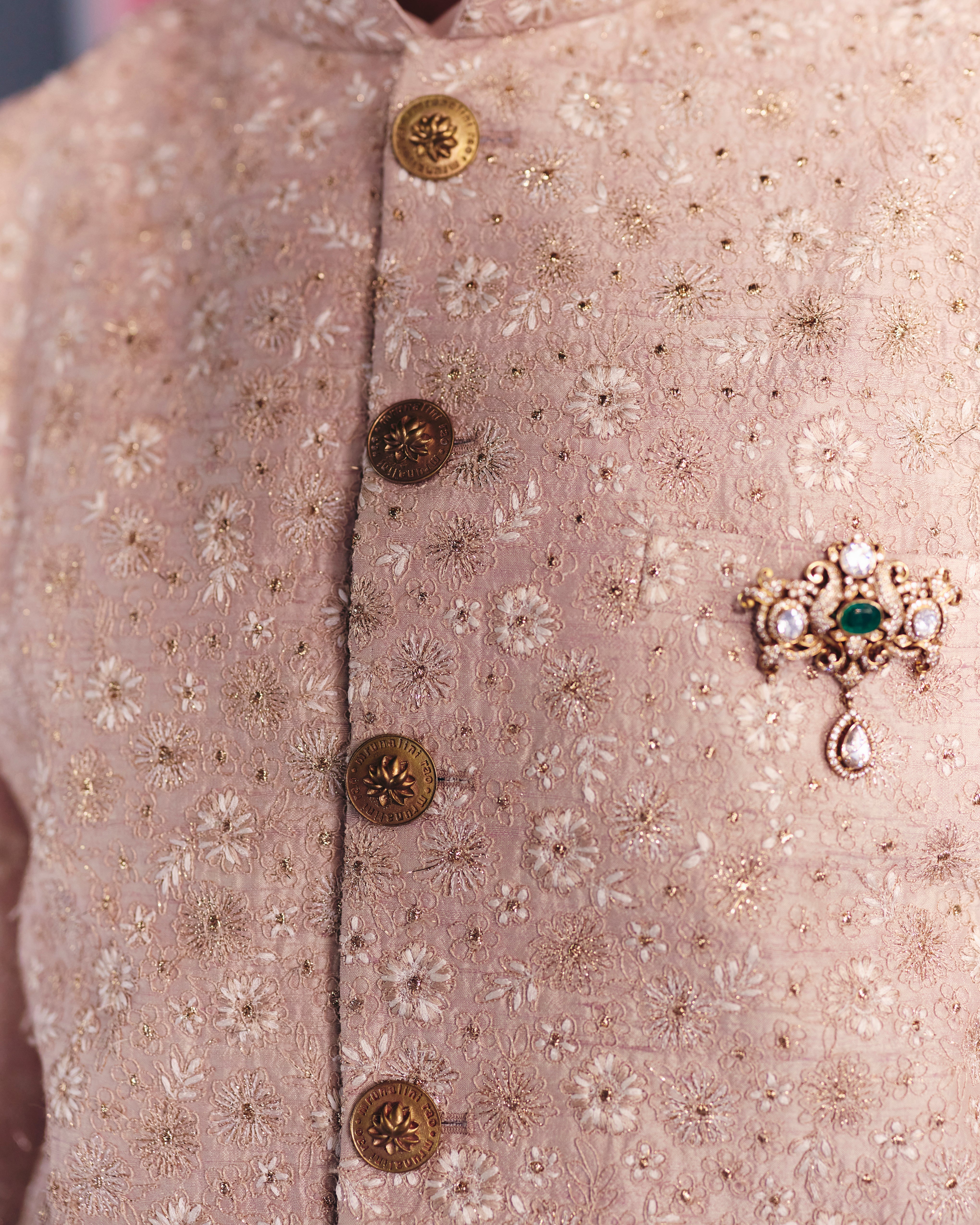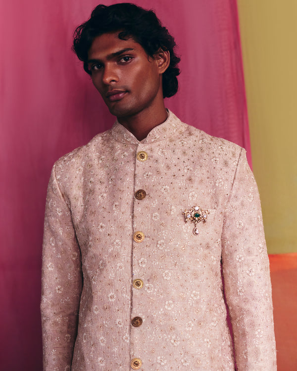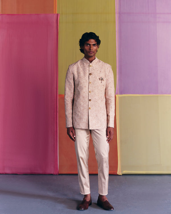 A beige raw silk bandhgala embroidered all over with ivory resham, dori, and badla, paired with beige cotton straight pants and a beige silk inner shirt.