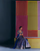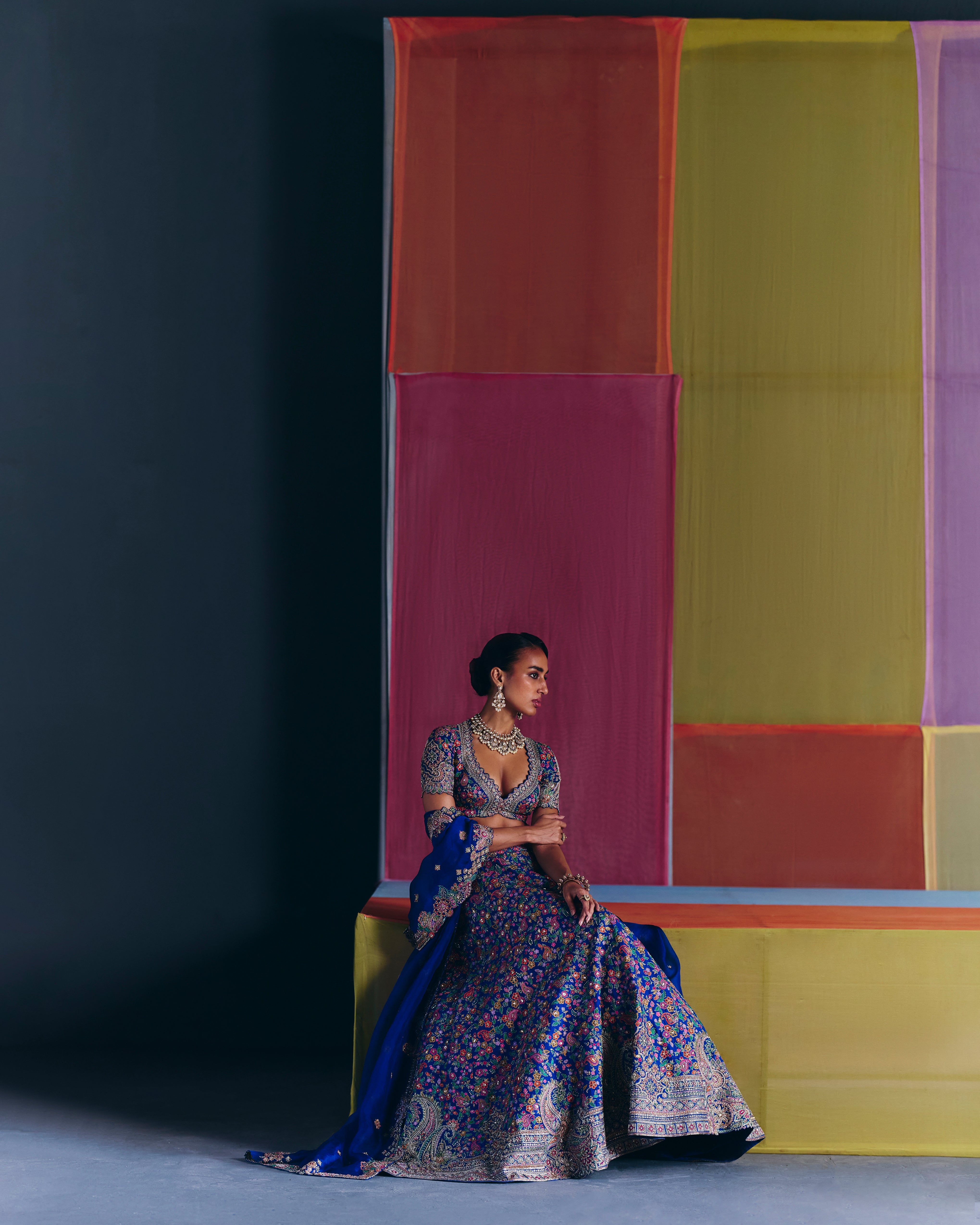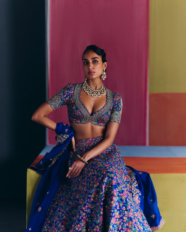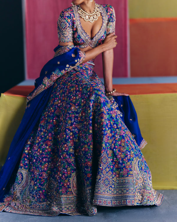 A royal blue raw silk lehenga adorned with an intricate jaal and an elaborate border featuring ornate paisleys and geometric motifs, crafted in multicolored resham and zardozi embroidery. Paired with a raw silk blouse and an organza dupatta, both showcasing similar artwork and embroidery techniques as the lehenga.