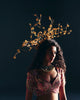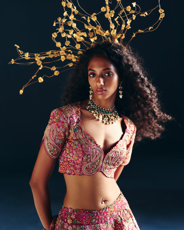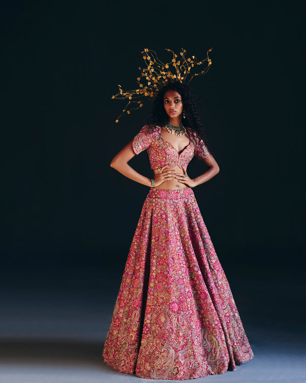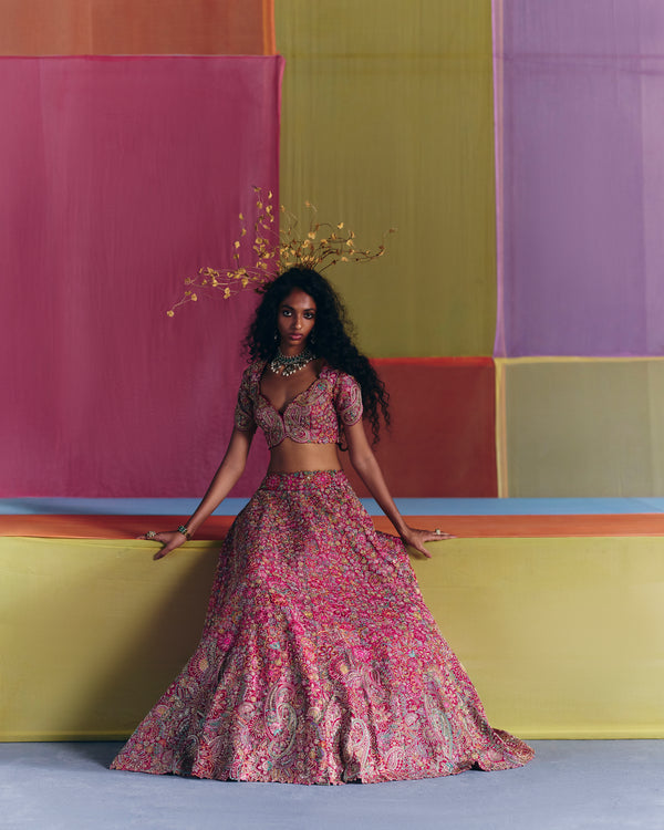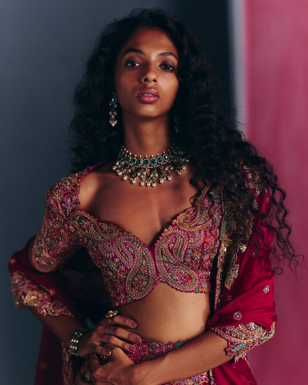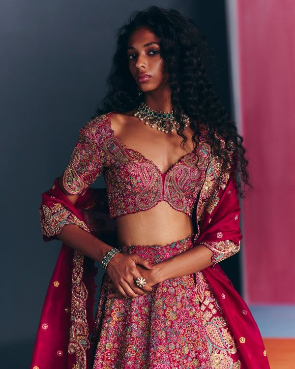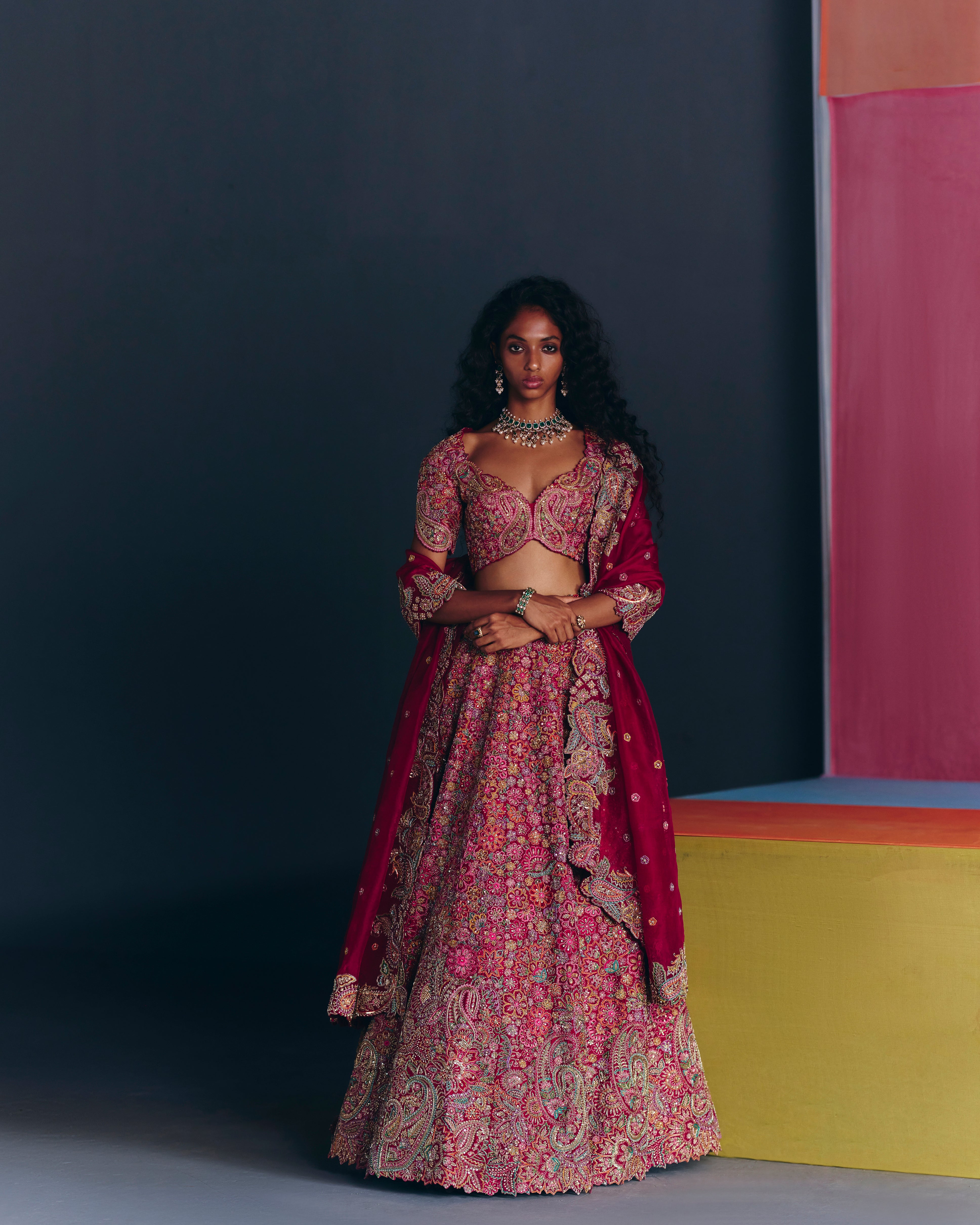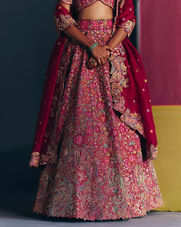 A maroon silk lehenga adorned with ornate floral motifs and signature paisleys along the border, seamlessly blending into contemporary flowers, embroidered in multicolored resham and zardozi. It is paired with a raw silk blouse and an organza dupatta, both featuring similar artwork and embroidery techniques as the lehenga.