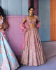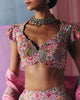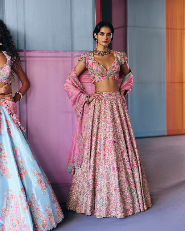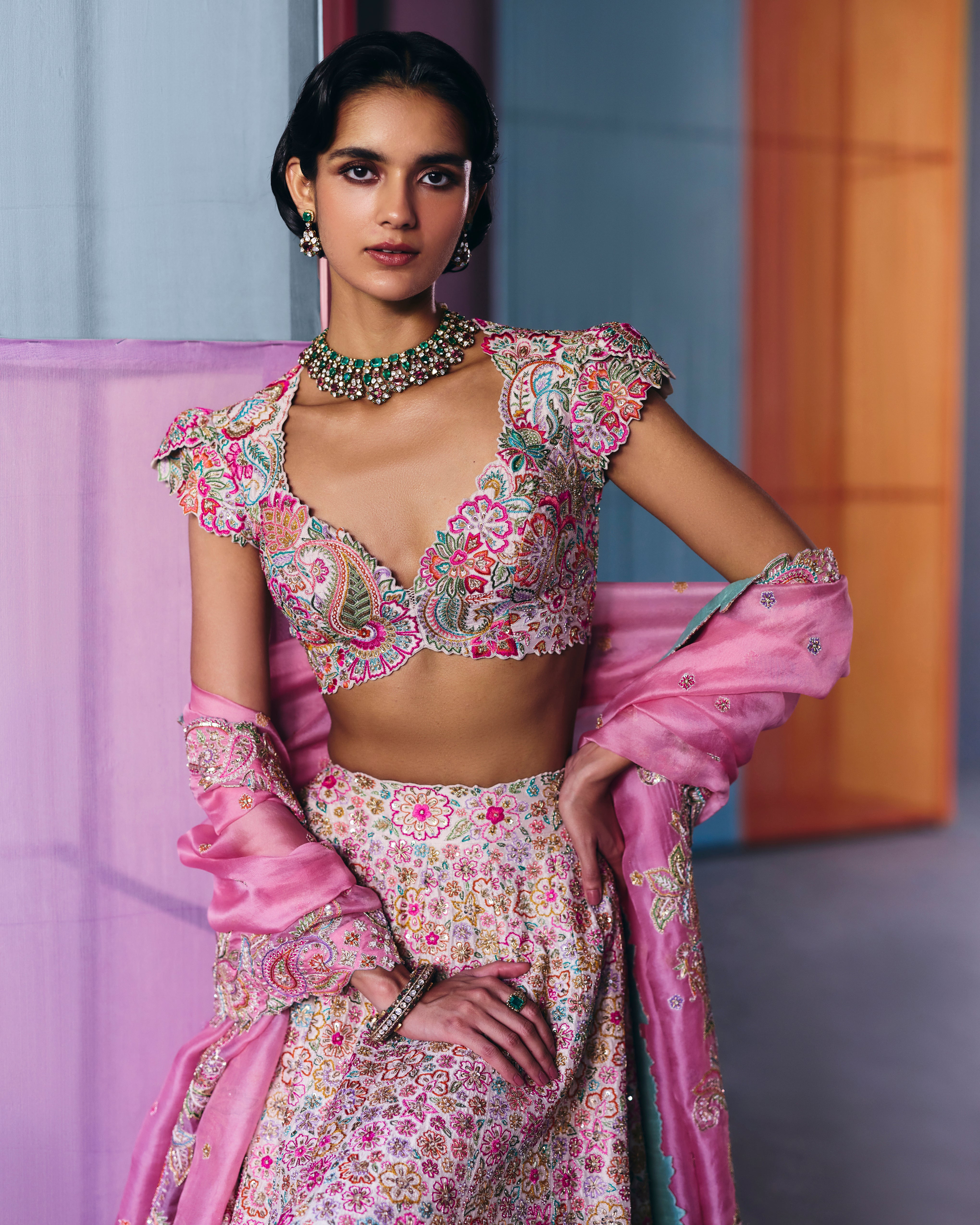 An ivory silk lehenga featuring ornate florals and signature paisleys at the hem, blending into contemporary motifs in multicoloured resham and zardozi. Paired with a raw silk petal-sleeve blouse in multicoloured resham embroidery and a contrast baby pink organza dupatta finished with handmade tassels.