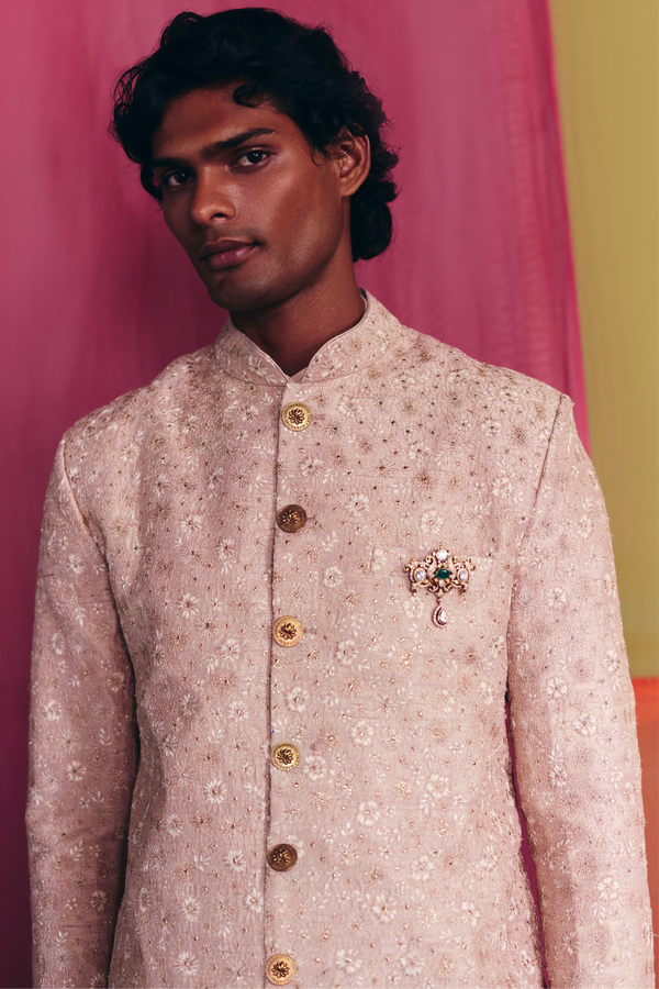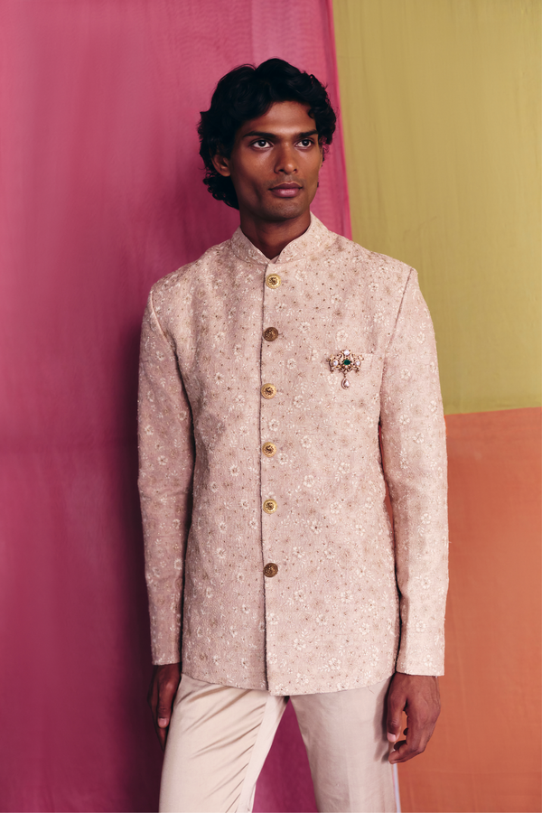 A beige raw silk bandhgala embroidered all over with ivory resham, dori, and badla, paired with beige cotton straight pants and a beige silk inner shirt.