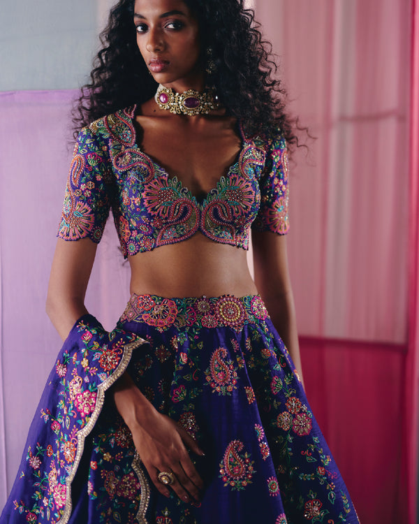 A purple raw silk lehenga crafted with three unique artworks—paisleys, geometric buttas, and intricate jaal—arranged in alternating panels and finished with a scalloped border. Hand-embroidered with multicolored resham and zardozi, it is paired with a raw silk blouse and an organza dupatta featuring intricate jaal along the scalloped border.